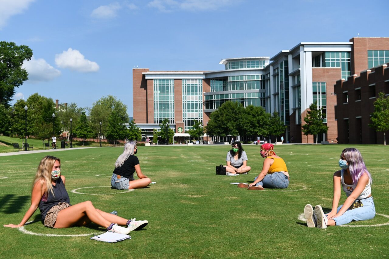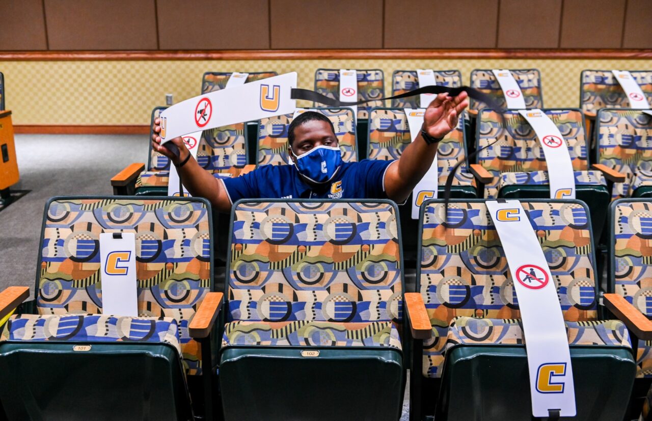 To practice six-foot social distancing, seats in auditoriums and classes were marked off with tape