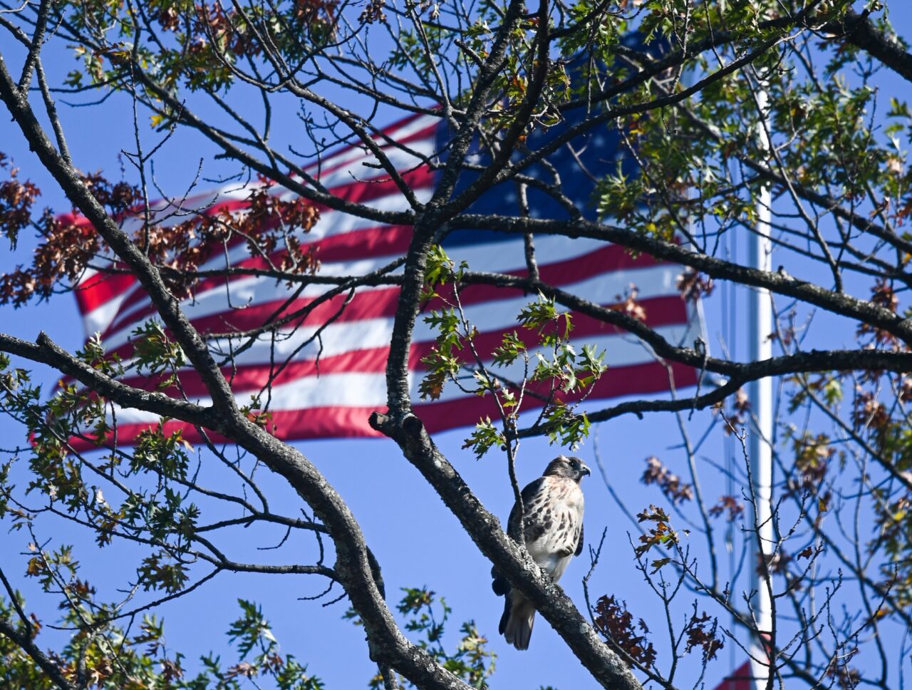 A juvenile red-tailed hawk sits in a tree near Founders Hall in September.