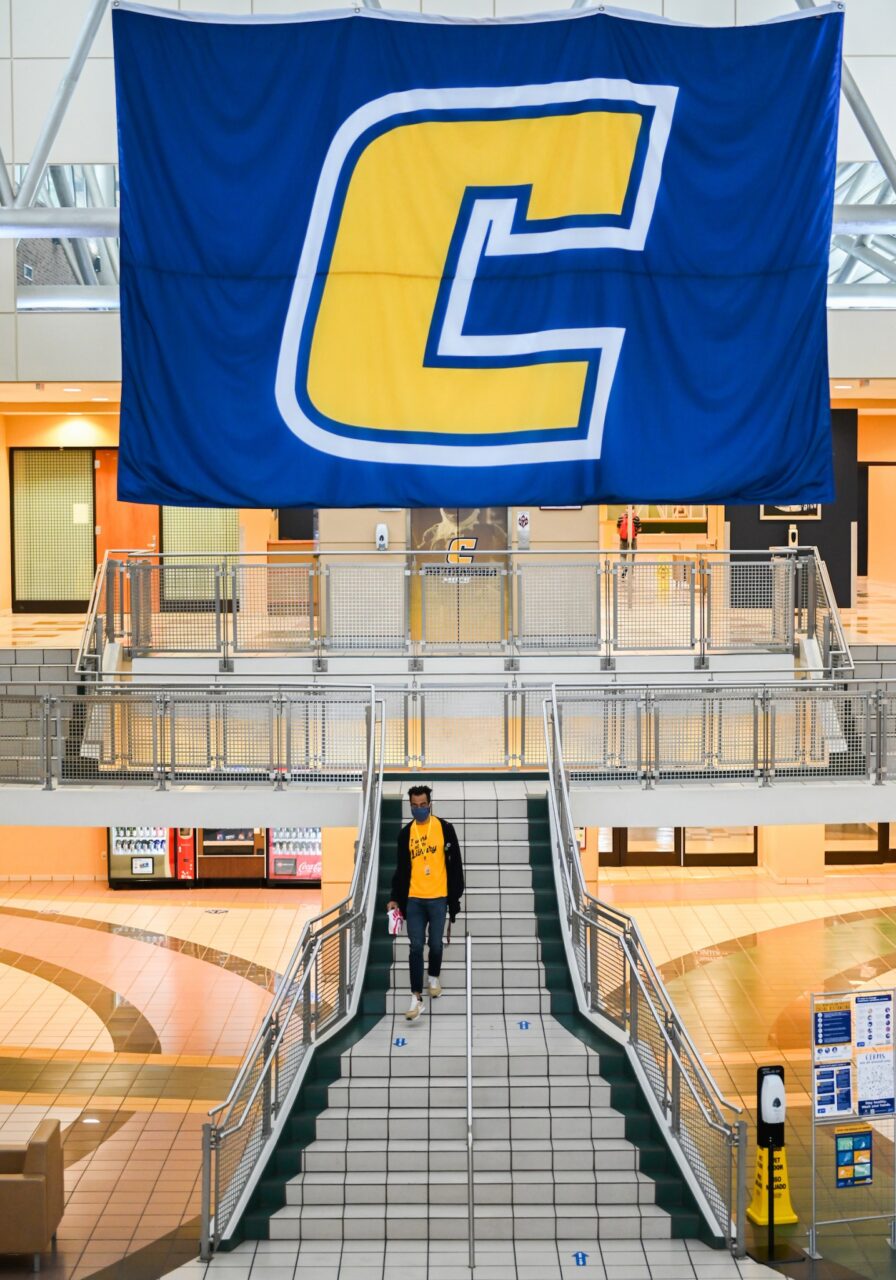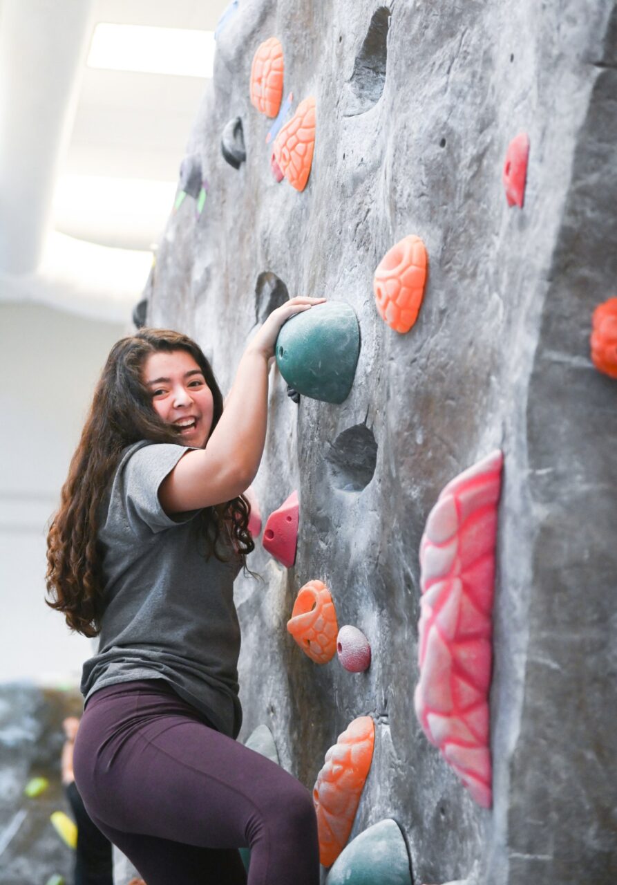 Student members in Mocs LEAD (Leaders Encouraging A Difference) practice their climbing skills in the Aquatic and Recreation Center.