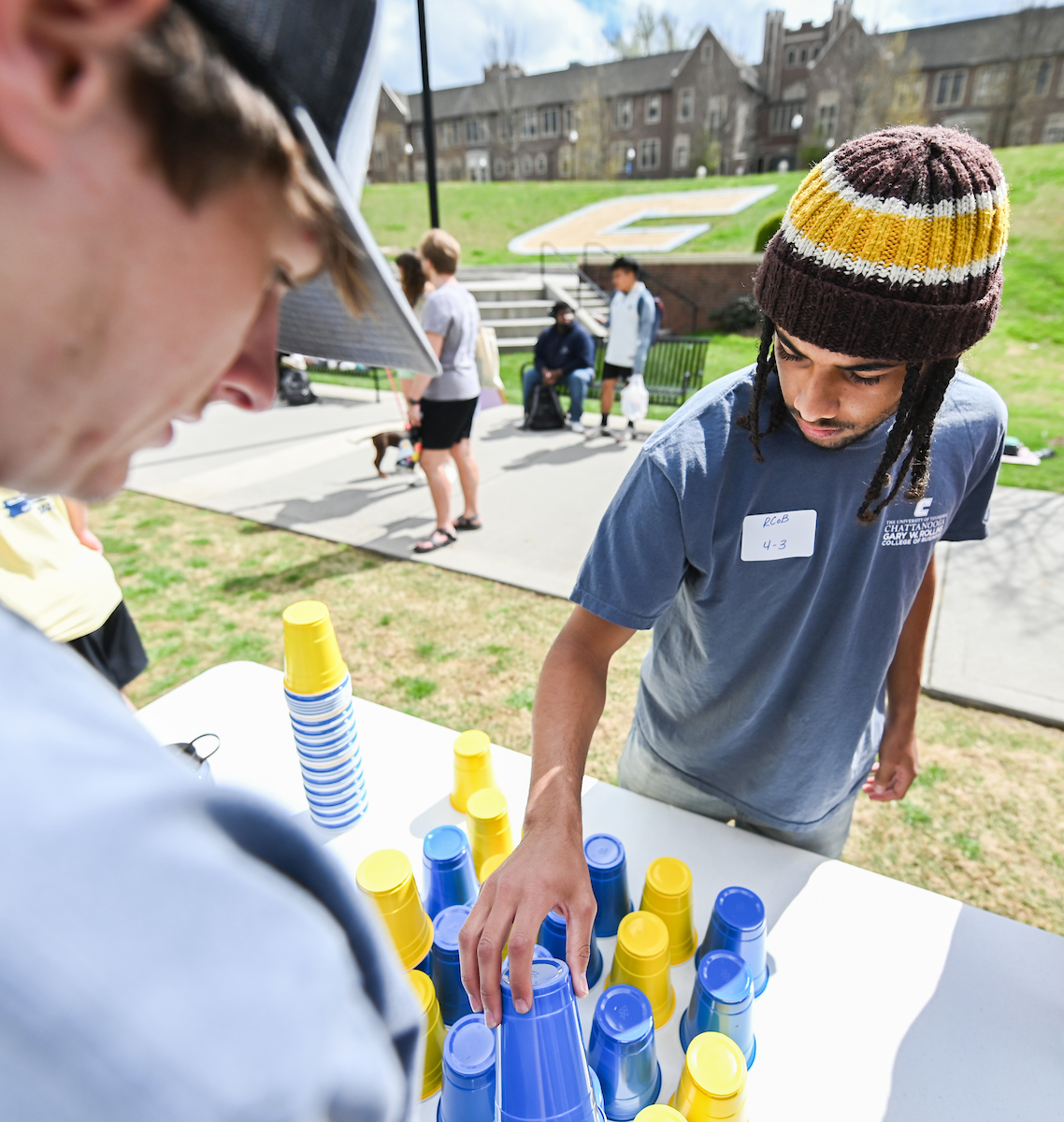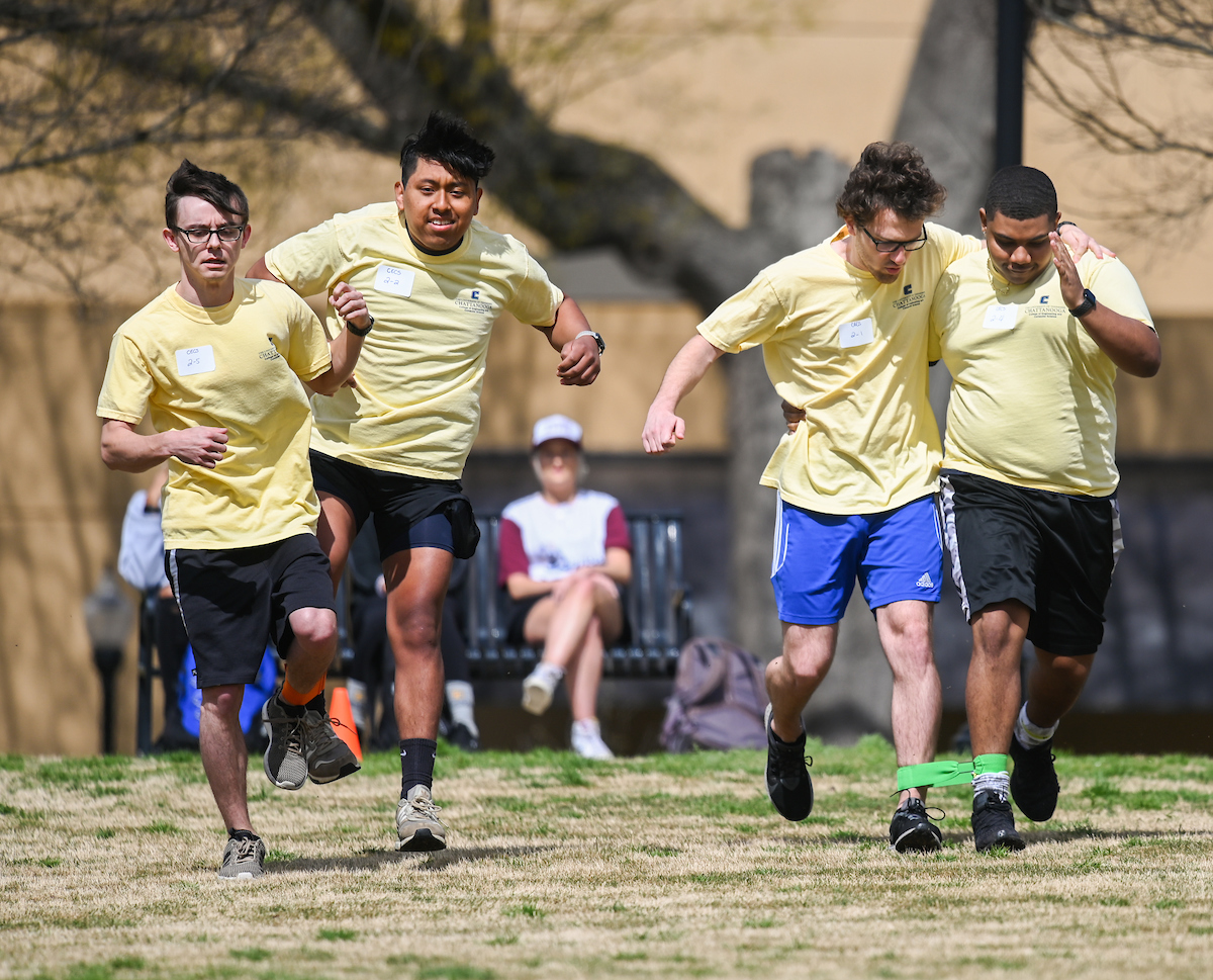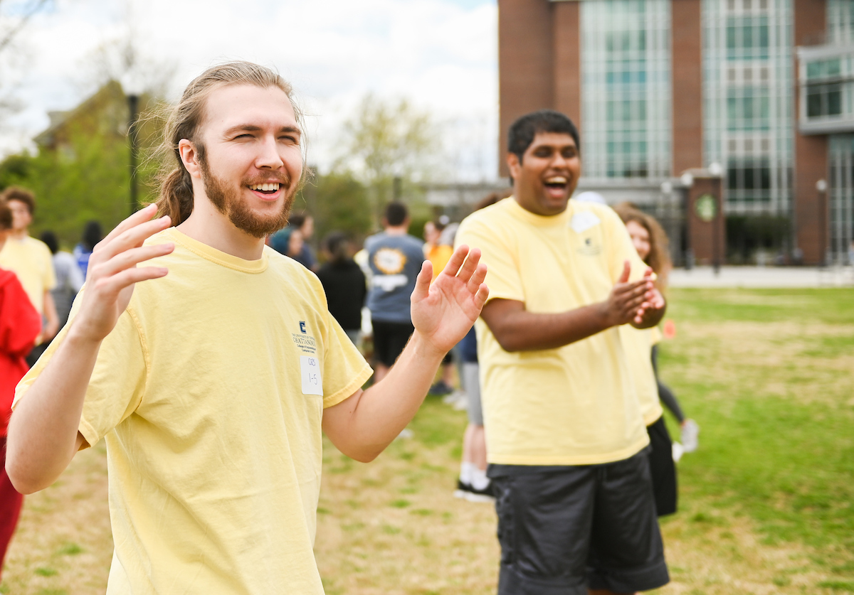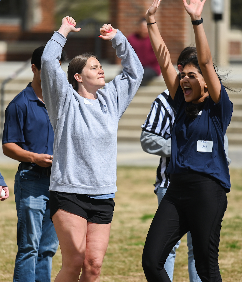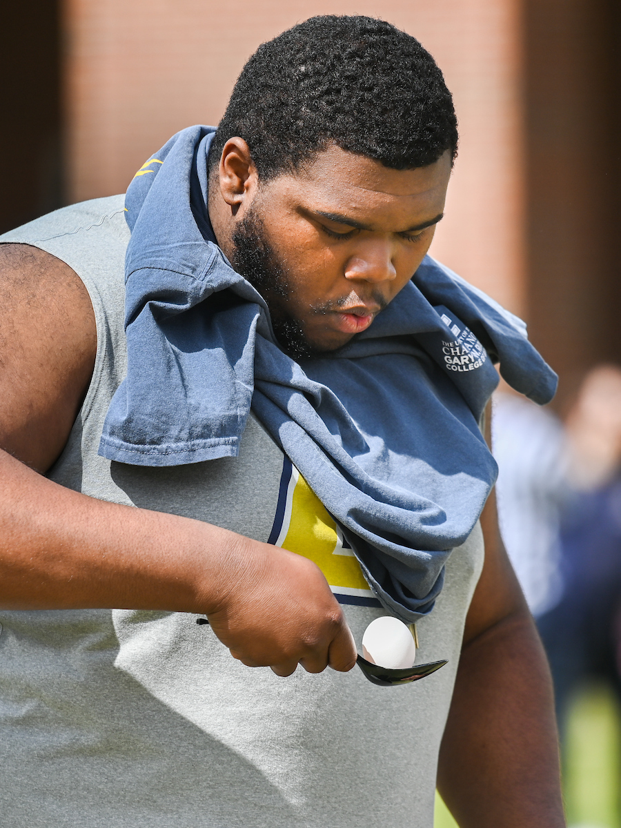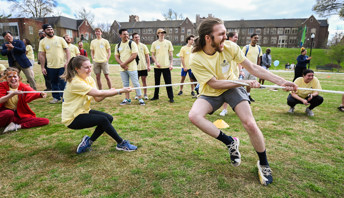 Teams from the Colleges of Business and Engineering faced off Thursday on Chamberlain Field for the first Field Games. The “heated” competition included egg and three-legged races, cup stacking, cornhole, tug of war and lots of laughing. The College of Business was the ultimate champ. In the photos below, Business is in the blue shirts and Engineering in the yellow.