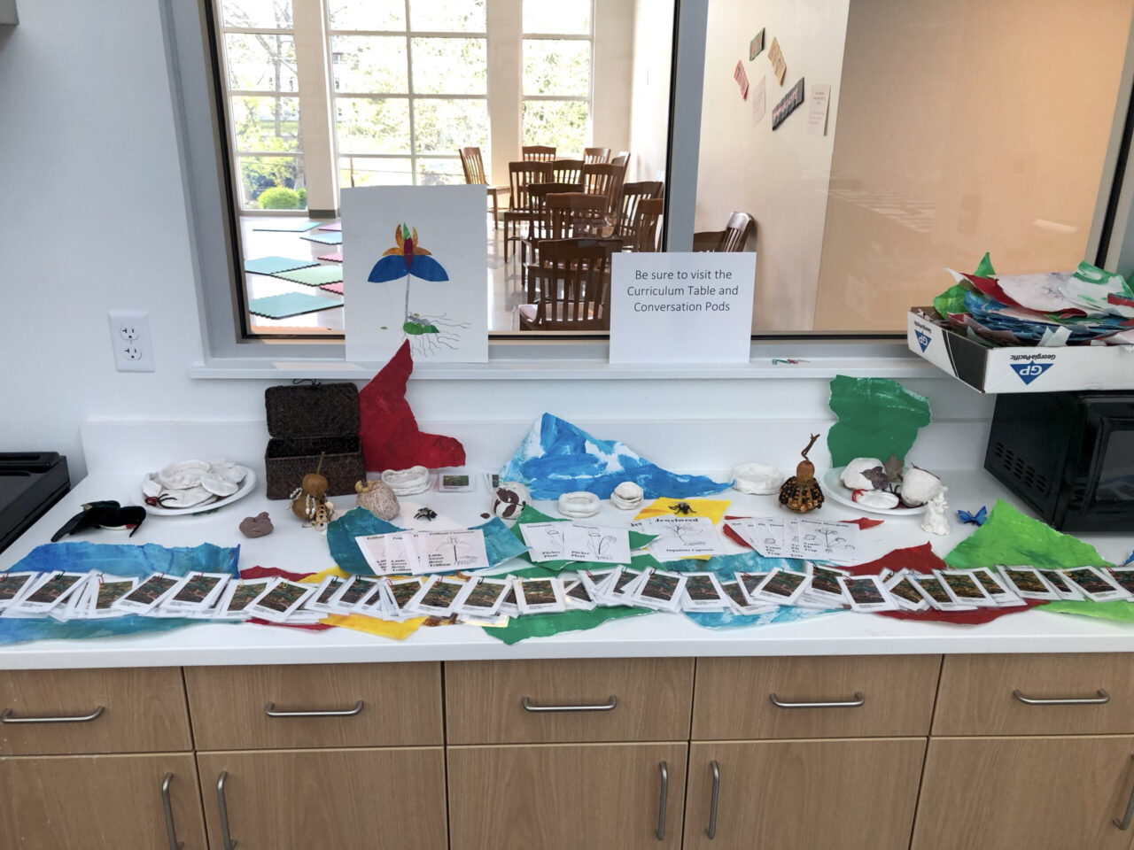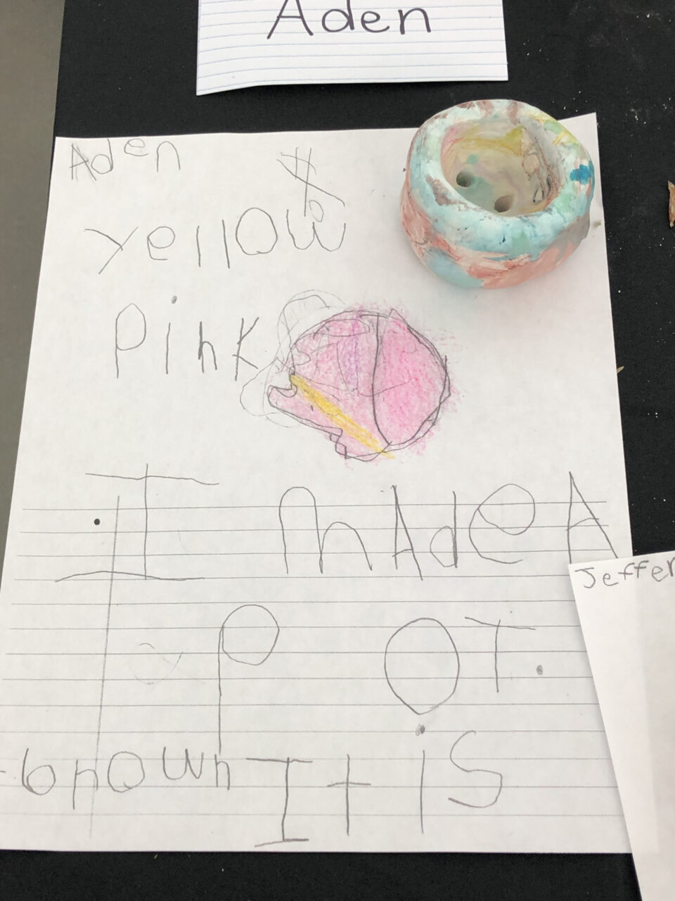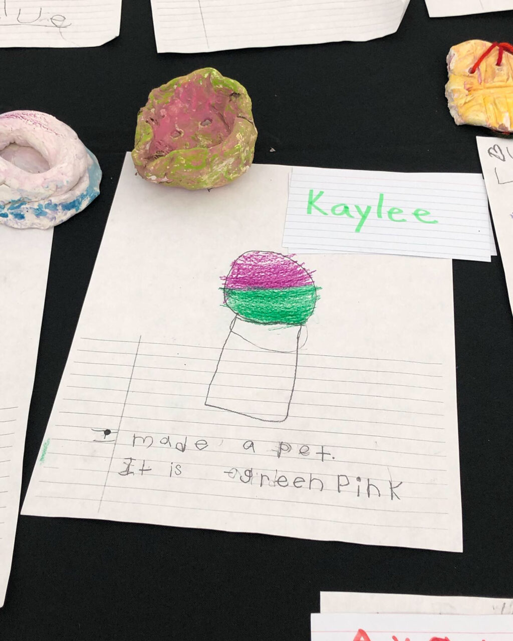 At the April exhibit, the children and their families got to see the artwork mounted on black backing on the Montessori Elementary walls thanks to the work of Dittmar’s Arts-Based Collaborative colleagues, Laurie Melnik Allen, Bill Floyd and Thaddeus Taylor. Collages, pottery and field journals were spread around for the parents to view.