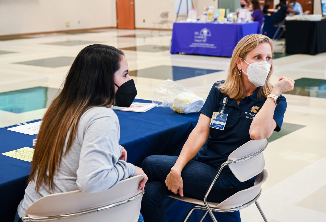 Nikki Goddard, a graduate student in the family nurse practitioner program, talks to a Minority Health Fair attendee.