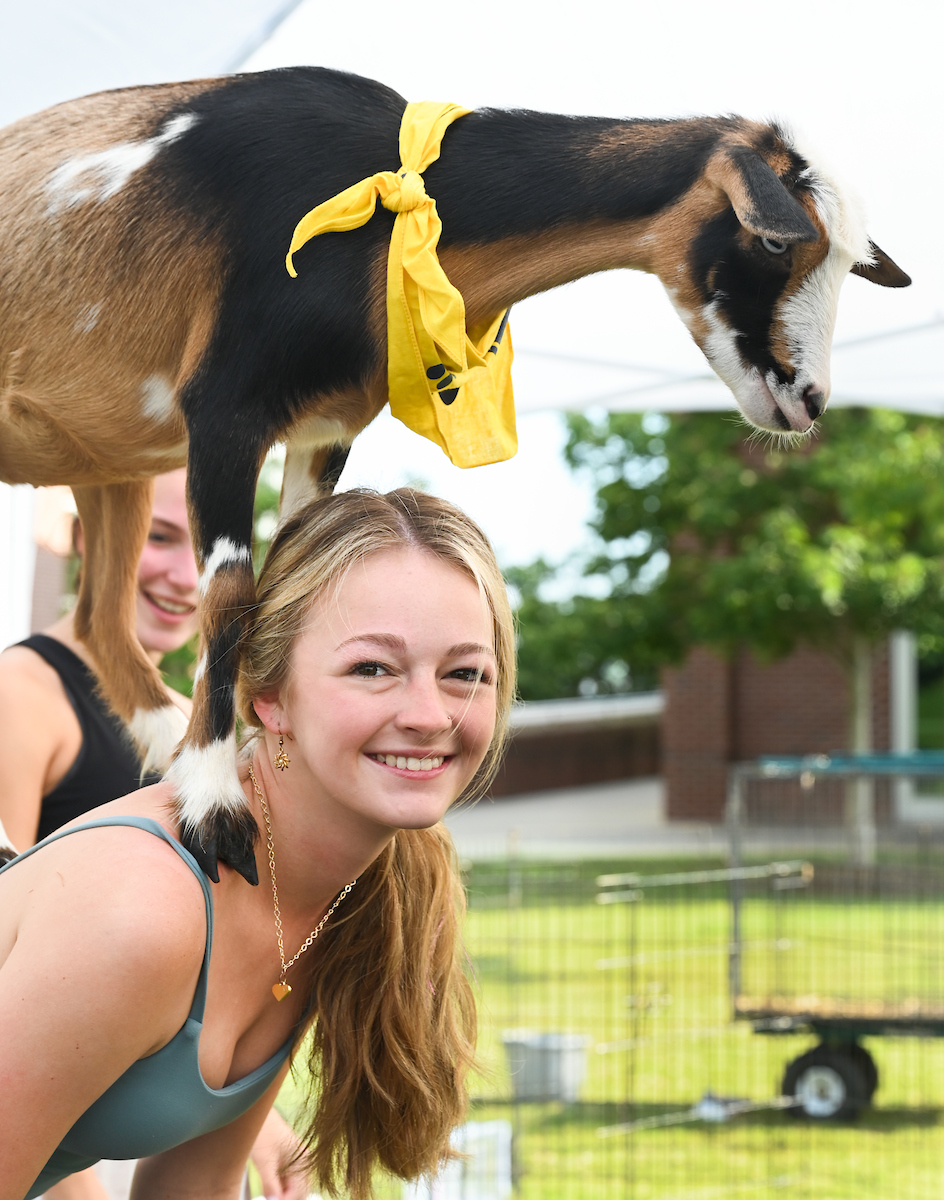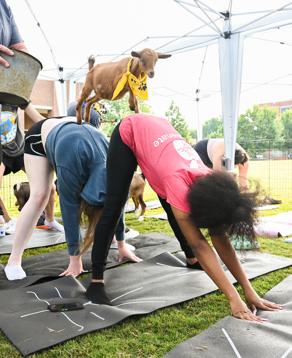 It wasn’t like Holihan, who’s from Franklin, Tennessee, unexpectedly found himself with a goat standing on him. He was one of the students taking part in a goat yoga session on Chamberlain Field on Wednesday, Aug. 24.