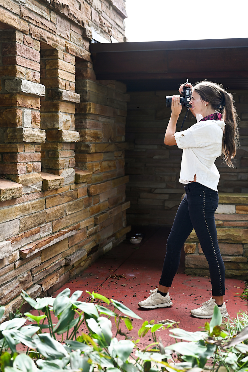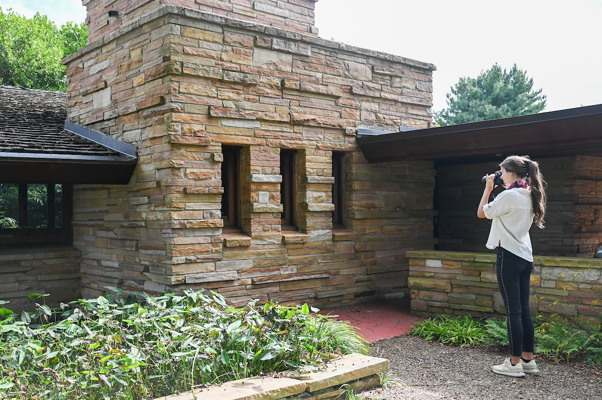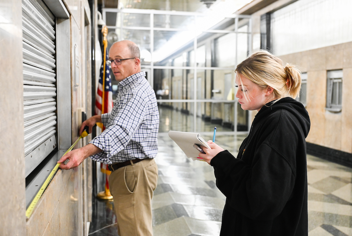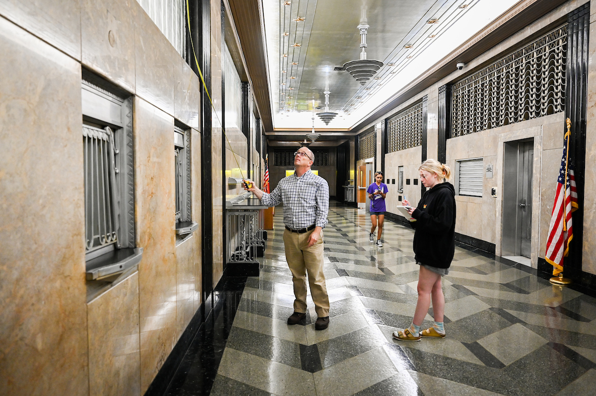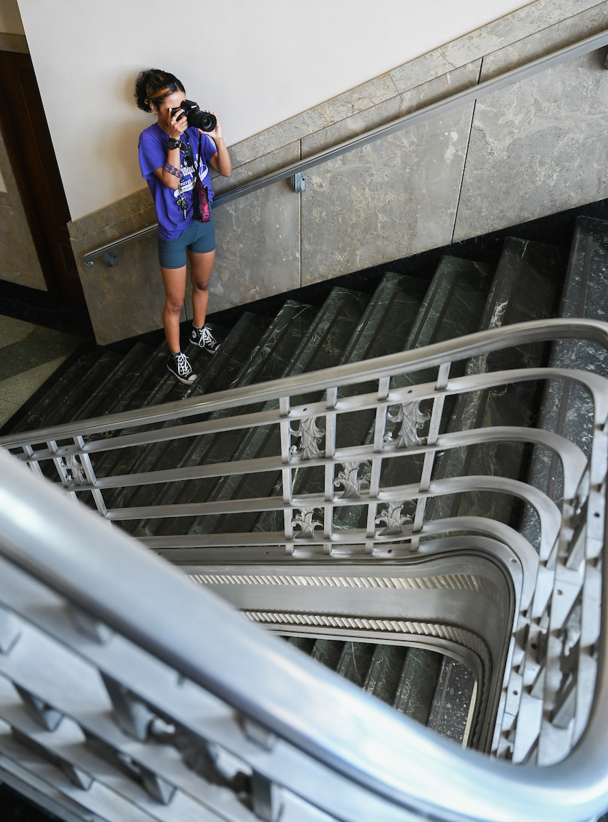 Student KiAna Queener photographs historic preservation details about the Joel W. Solomon Federal Courthouse in Chattanooga.