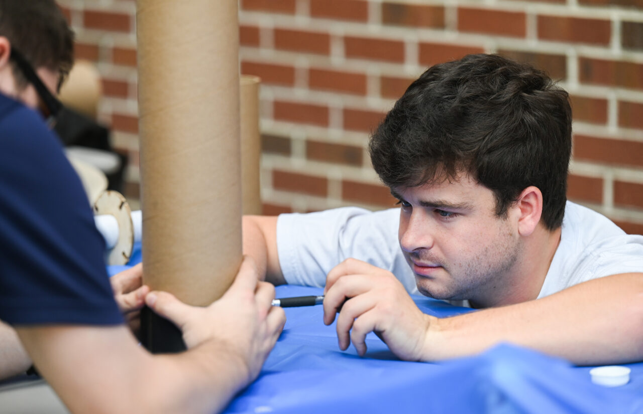 Rocket Mocs team members Mat Ormaza, left, and Elijah Schmiesing-Joyce work Friday, Oct. 7, 2022, on their certification rockets. Photo by Angela Foster.