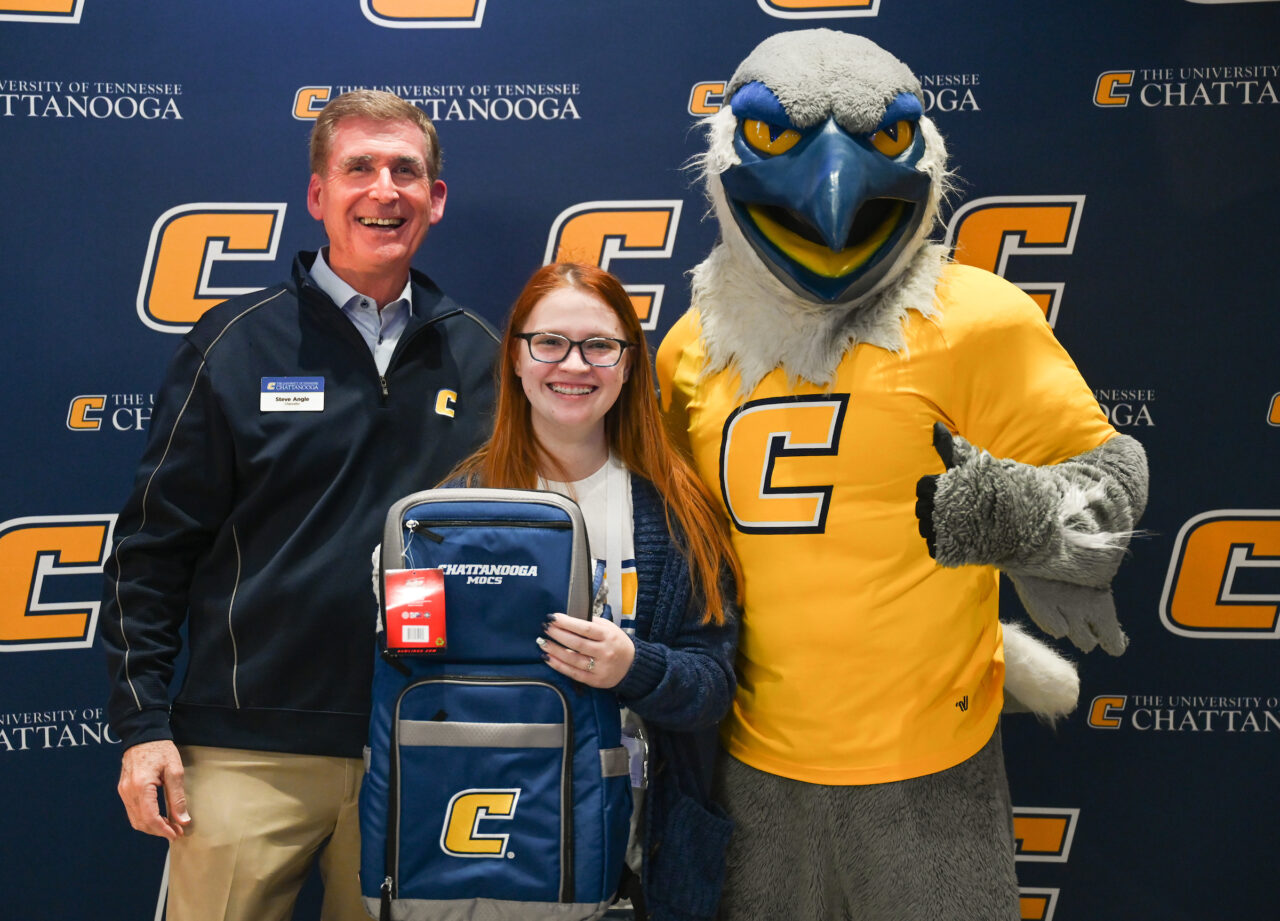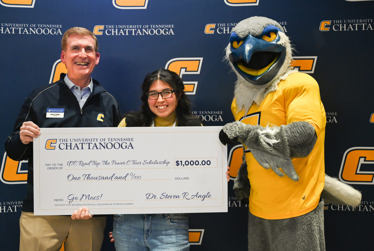UTC Chancellor Steven R. Angle and Scrappy present a $1,000 Power C scholarship to Kendall Townsend. The Chattanooga School for the Arts and Sciences senior was joined at the UTC Road Trip: The Power C Tour event by her mother, Yashika Ward. Photo by Angela Foster.