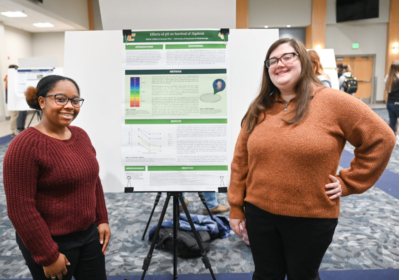 Ermaya Wise, left, and Skylar Calkins present their poster titled “Effects of pH on Survival of Daphnia.” Photo by Angela Foster.