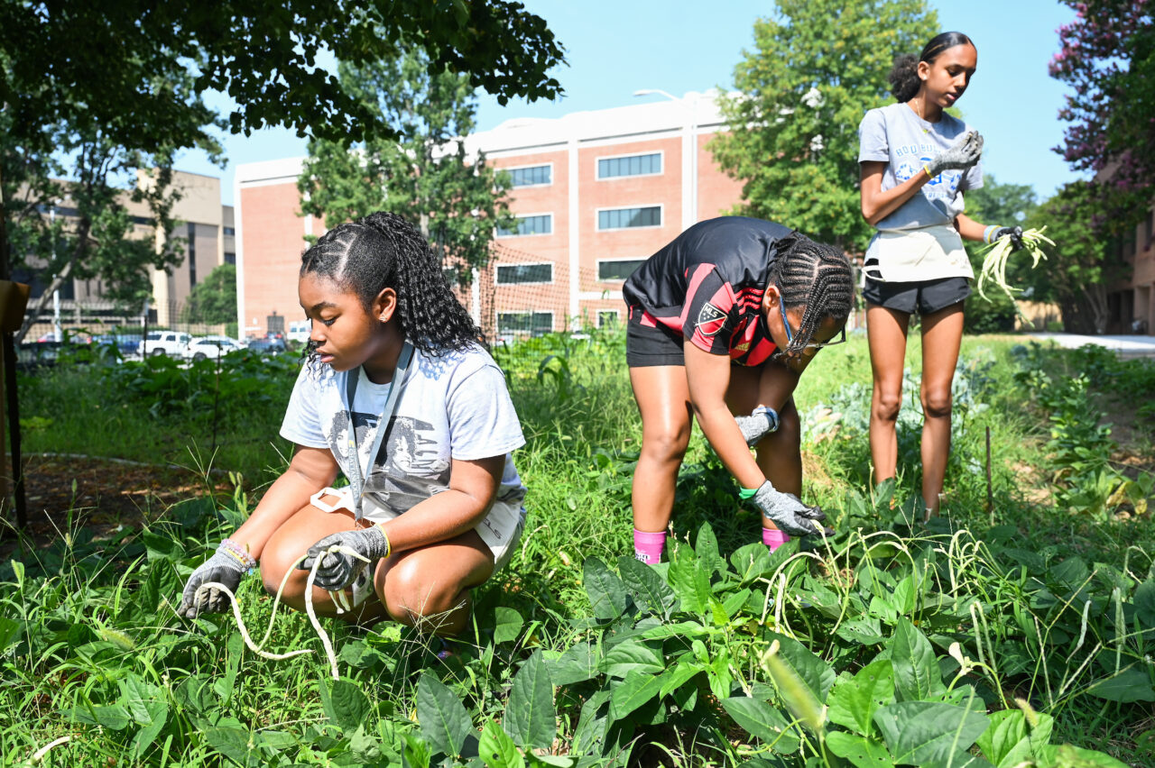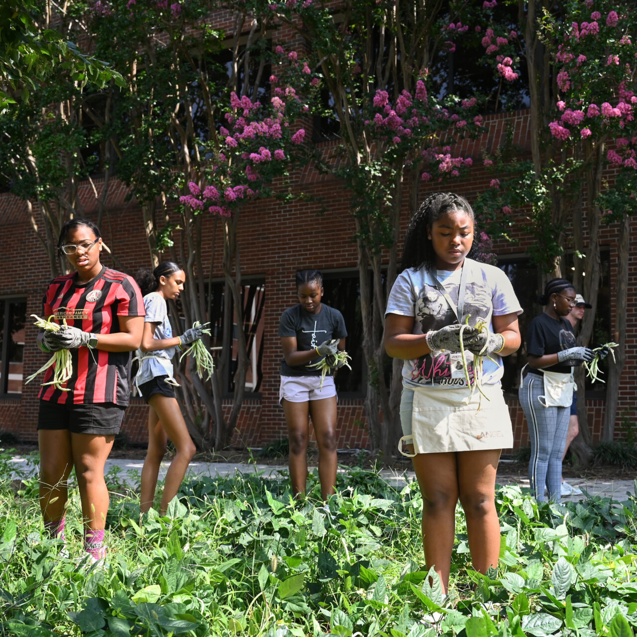 Dr. Jose Barbosa, left, and members of the ANGELS camp work in the Teaching and Learning Garden near Holt Hall.