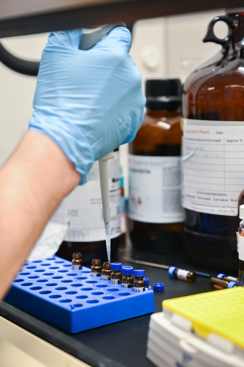 Baker Garrison, who plans to graduate from UTC in May 2024 with a bachelor’s degree in chemistry, conducts blood sample research. Garrison is part of a faculty and student team testing whether blood samples can be used to screen for endometrial cancer. Photo by Angela Foster.