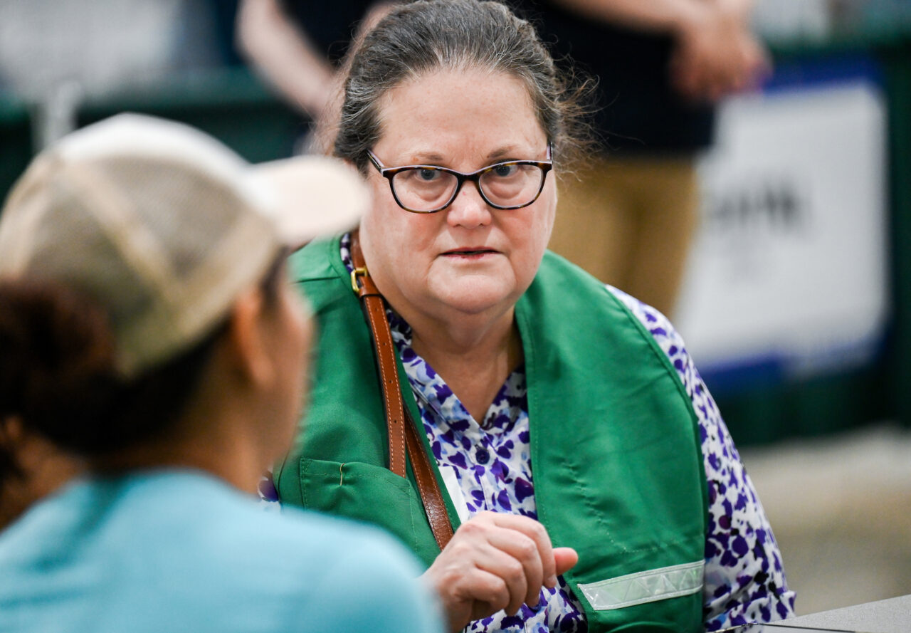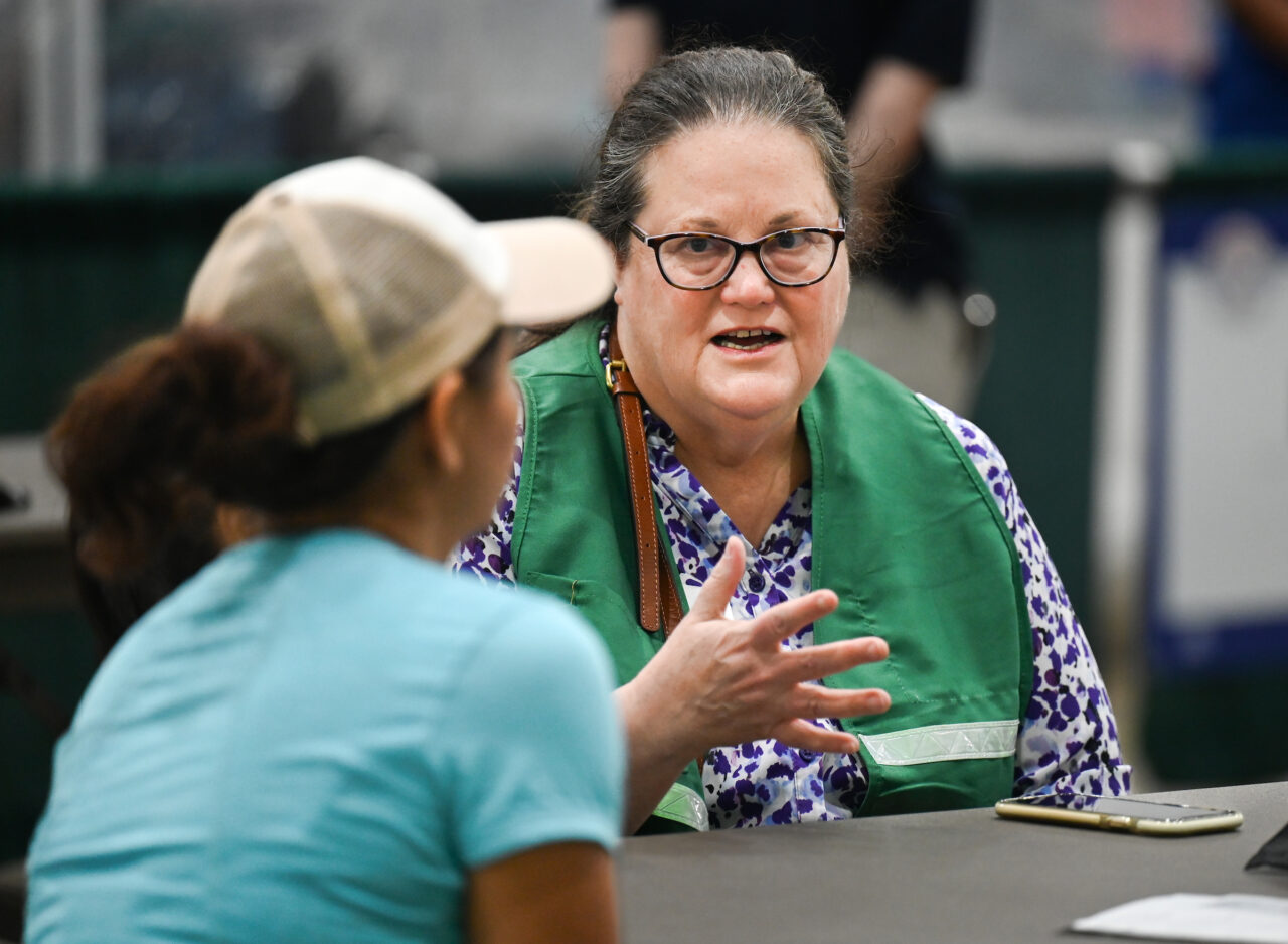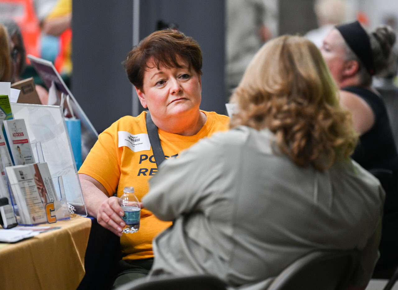 Master of Social Work graduate assistant Shelagh Watkins, right, talks to a patient at the Remote Area Medical (RAM) pop-up clinic on Saturday, Sept. 9, at the Camp Jordan Arena in East Ridge. Photo by Angela Foster.