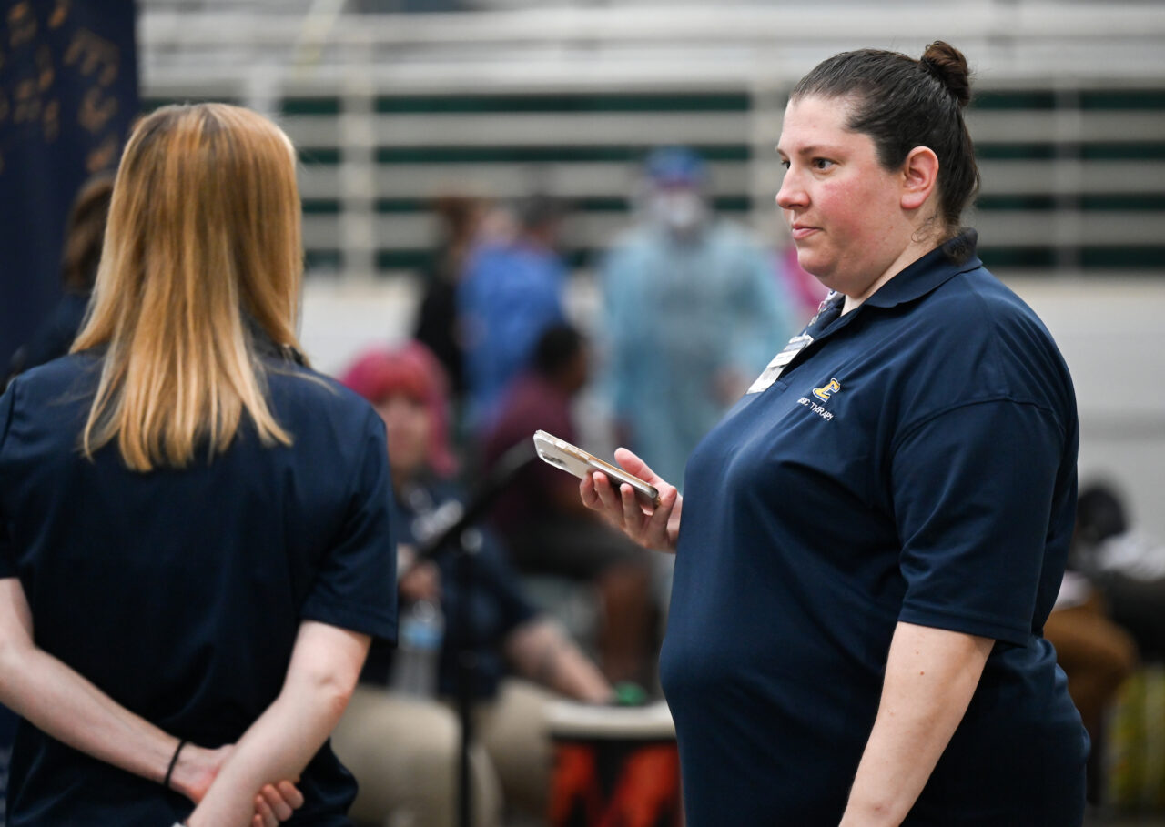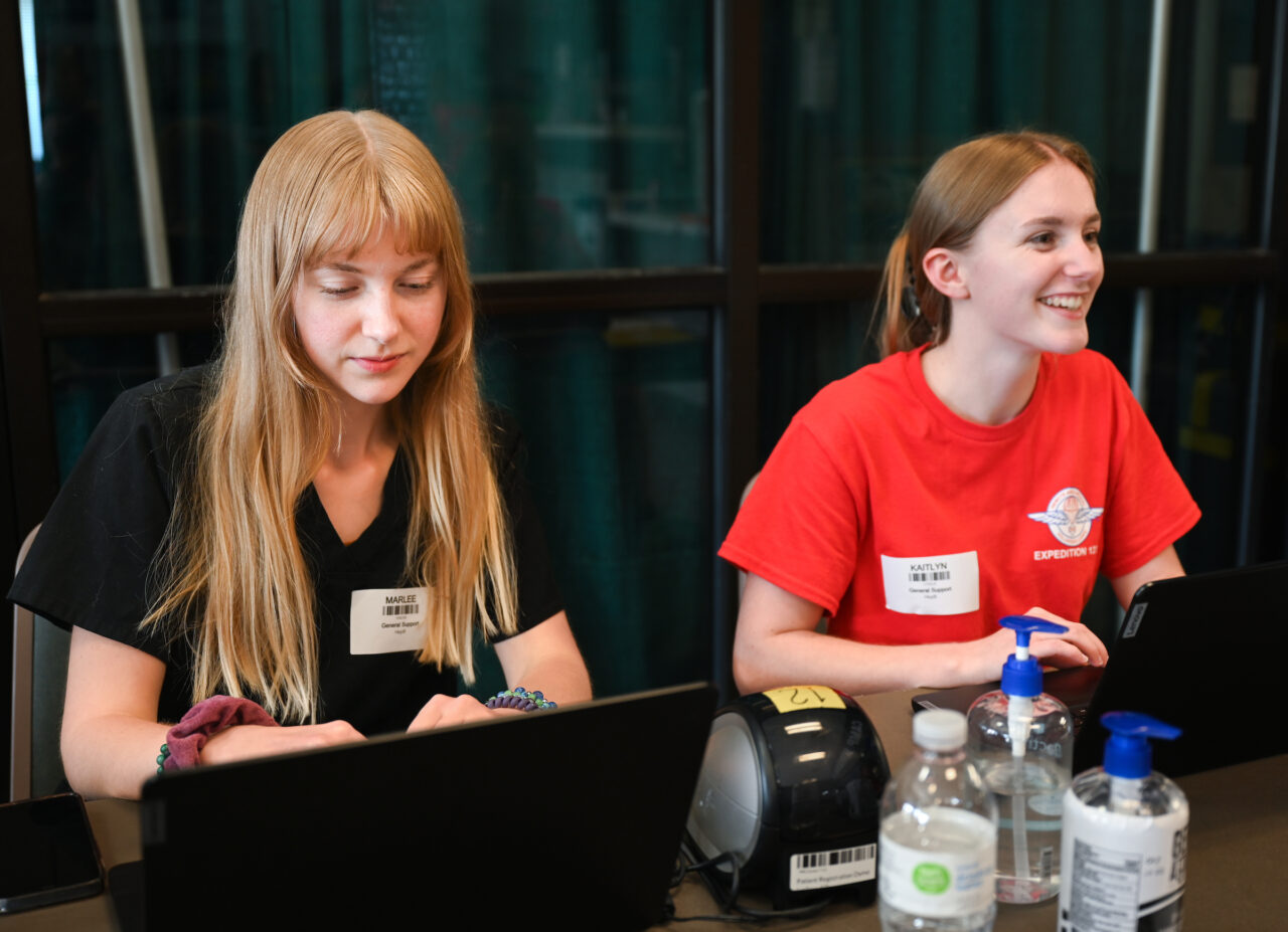 Kaitlyn Acuna, right., and members of UTC’s student RAM chapter checked in patients as they entered the Camp Jordan Arena facility.