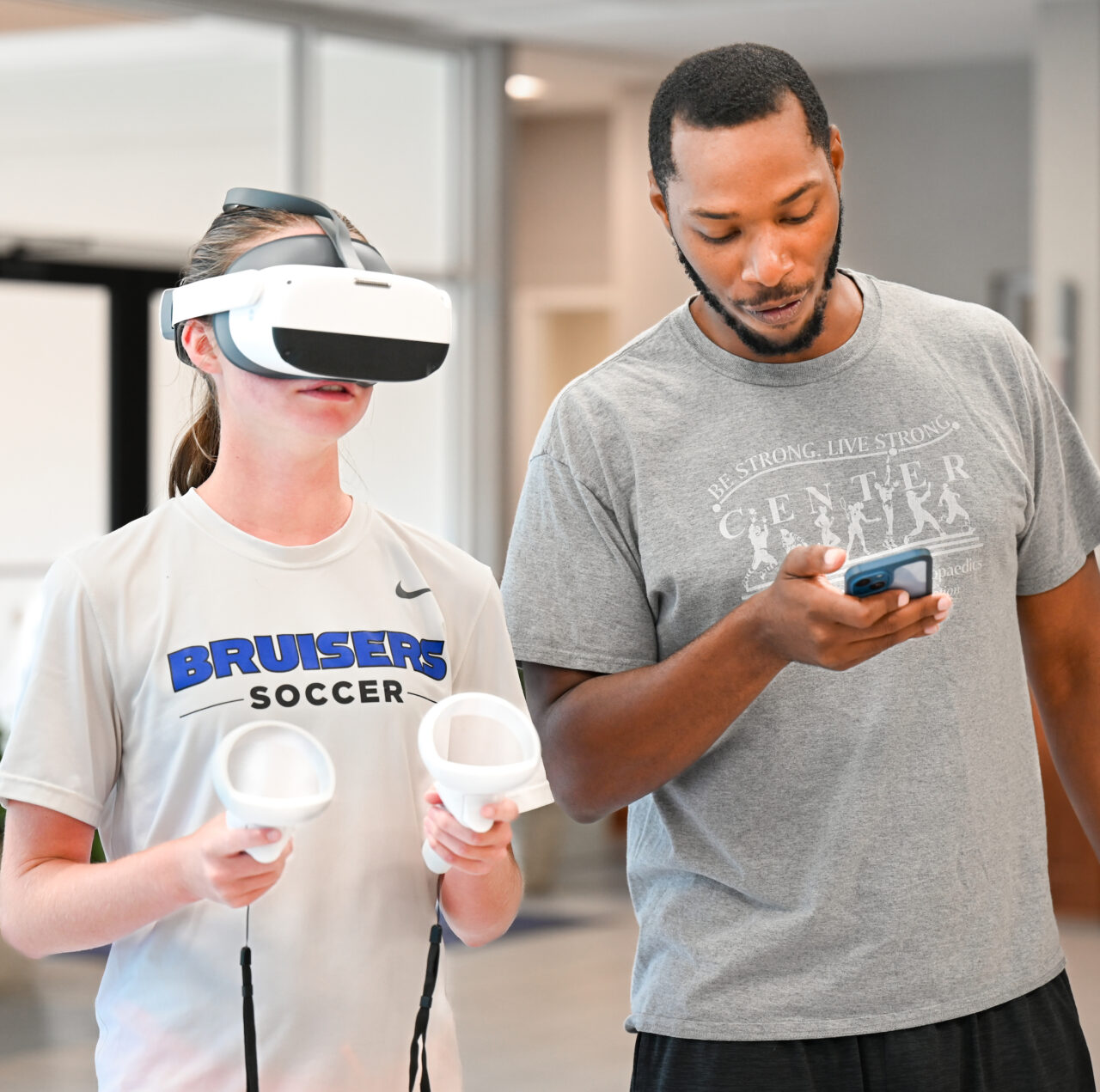 Girls Preparatory School Athletic Trainer Michael Loving , a two-time UTC alum, uses VR training while working with GPS soccer players. Photo by Angela Foster.