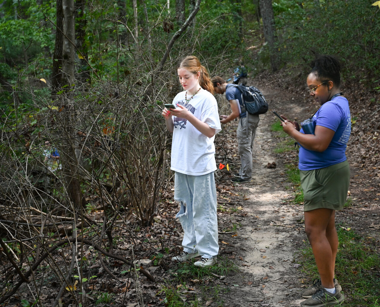 Students in Monica Miles’ Ecology Laboratory 3070 class, including junior Brooklynn Ashmore (far left), learned how to locate and tag invasive species at Reflection Riding.