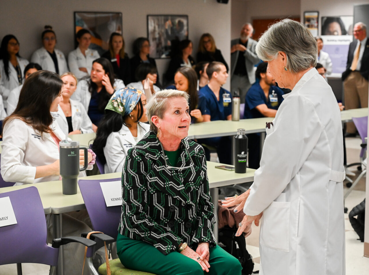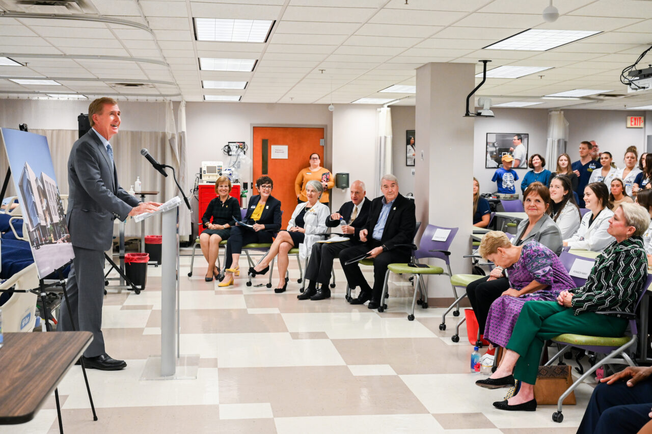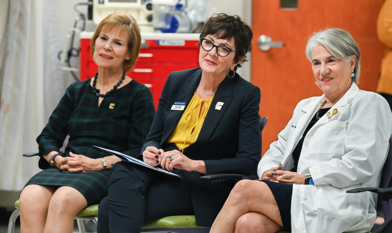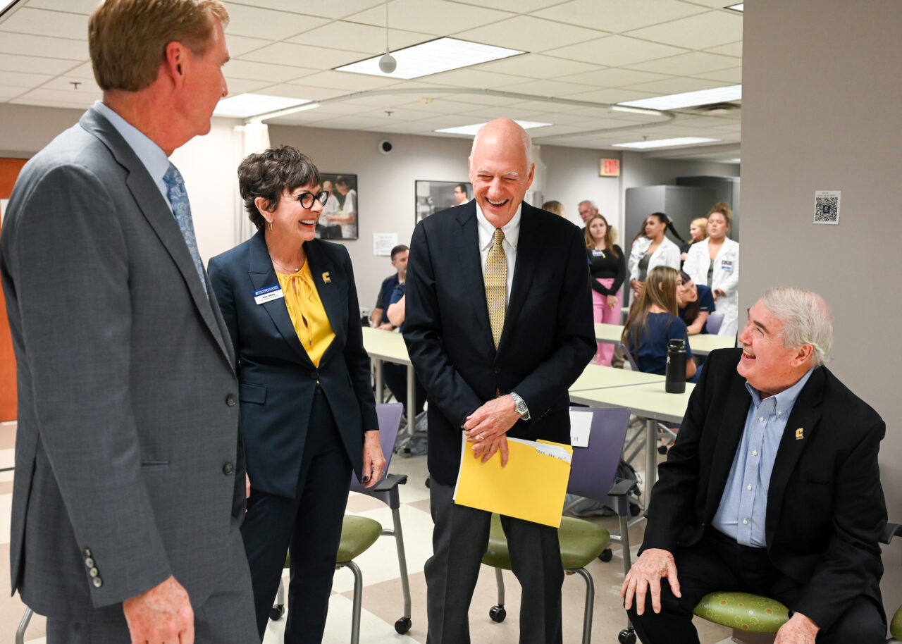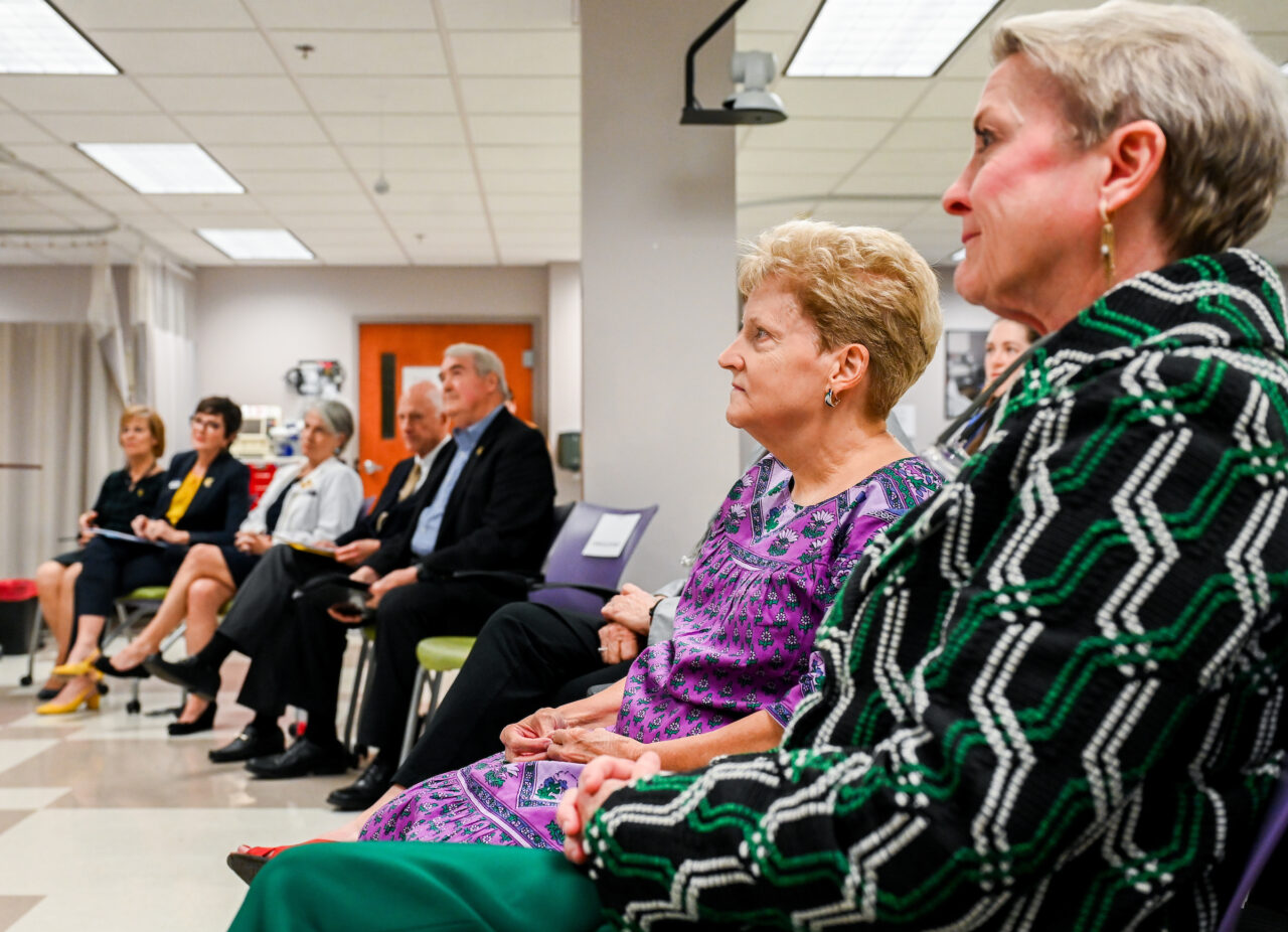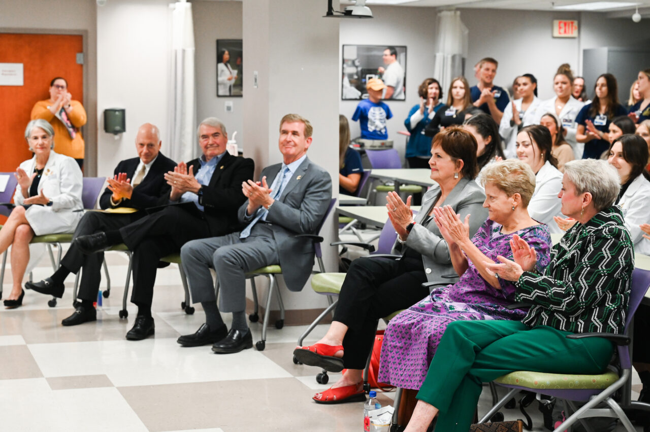 “The quality of the project was driven by the quality of our nursing program, and that’s a testament to the faculty and staff and students of the nursing program,” Angle said, turning to the many students and faculty among the standing-room-only crowd. “There would not have been a gift or support without all of you and what you do. Thank you for so many of the students, faculty and staff in our nursing program being here today. We salute you because you’re the ones responsible for this.”