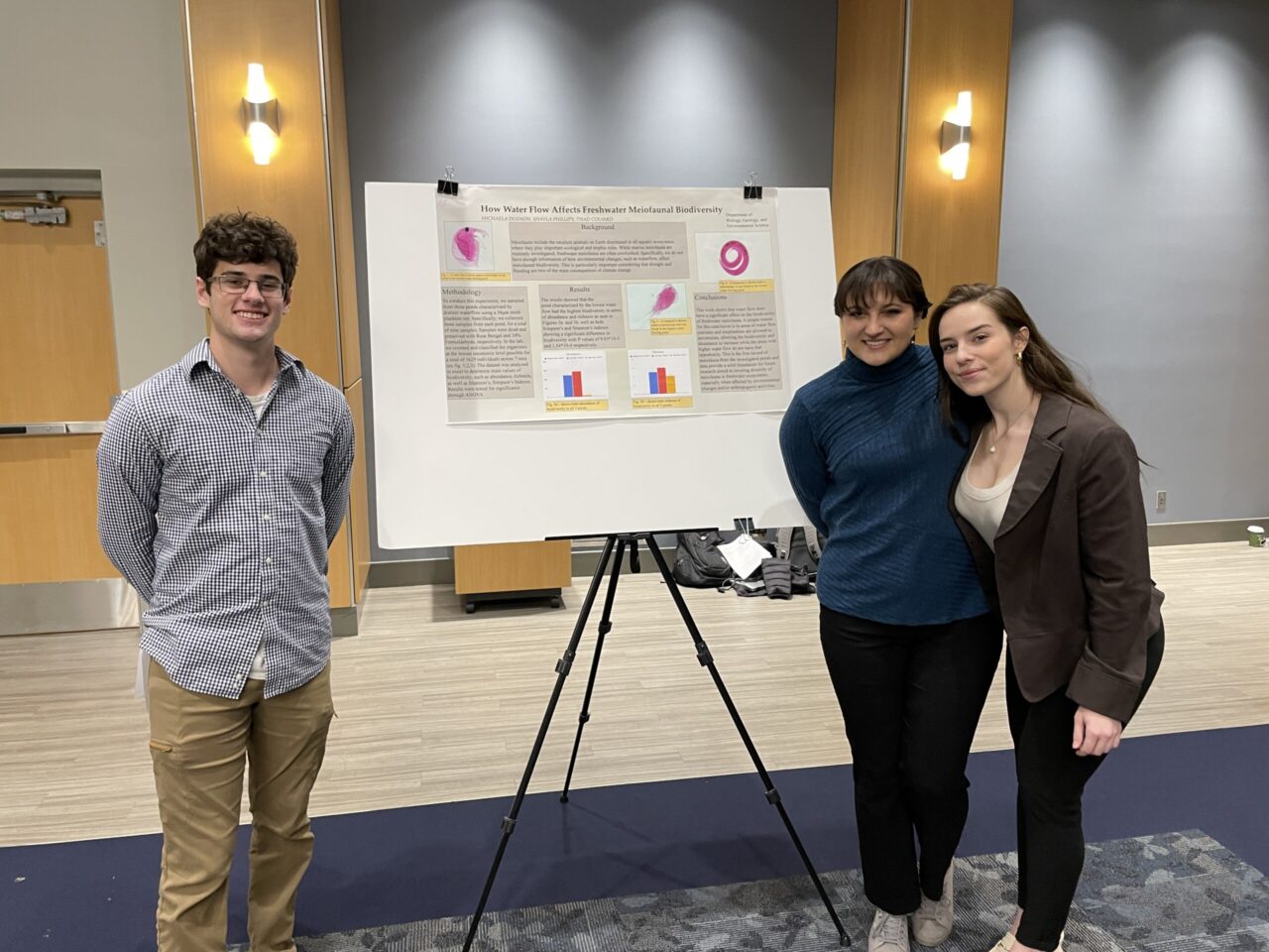 In their study on the effects of water flow on the diversity of meiofauna, Thad Colvard and Michaela Dodson, both seniors in environmental science, and Shayla Phillips, a senior in biology, checked out three different ponds—one with water flowing in, one with water flowing out and one that was self-contained.