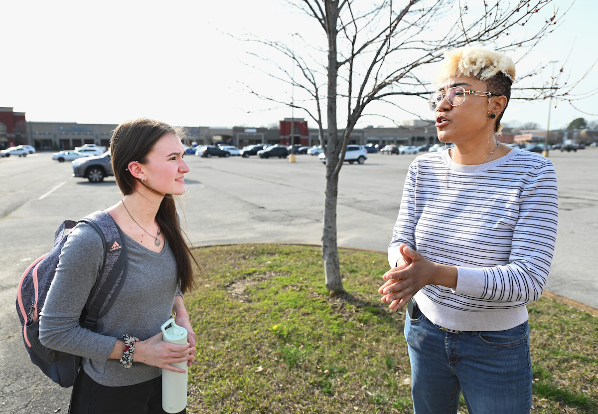 Dr. Chandra Ward, right, leads a UTC Sociology Club discussion during a CARTA bus tour of Chattanooga on Feb. 26.