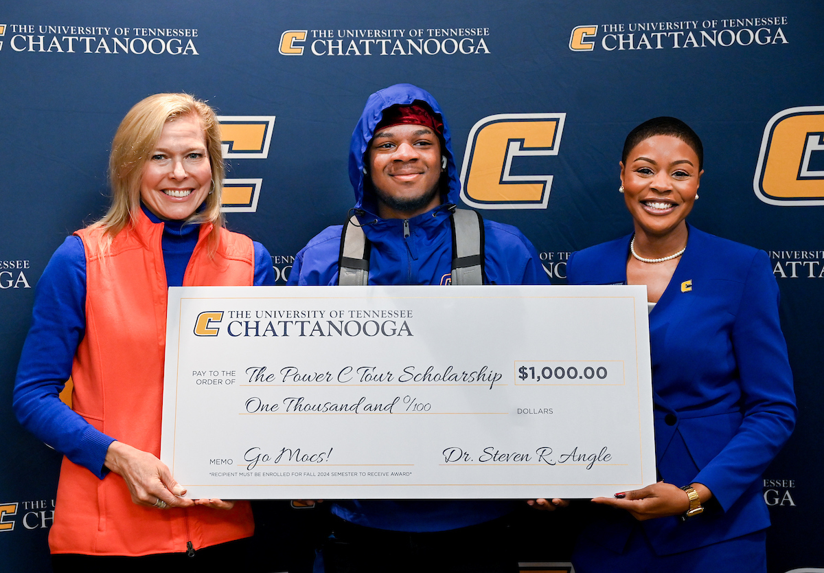 Chattanooga State Community College student Joshua Clay was one of two awarded the $1,000 Power C Tour Scholarship presented by ChattState President Rebecca Ashford, left, and UTC Vice Chancellor Artanya Wesley. Photo by Angela Foster.