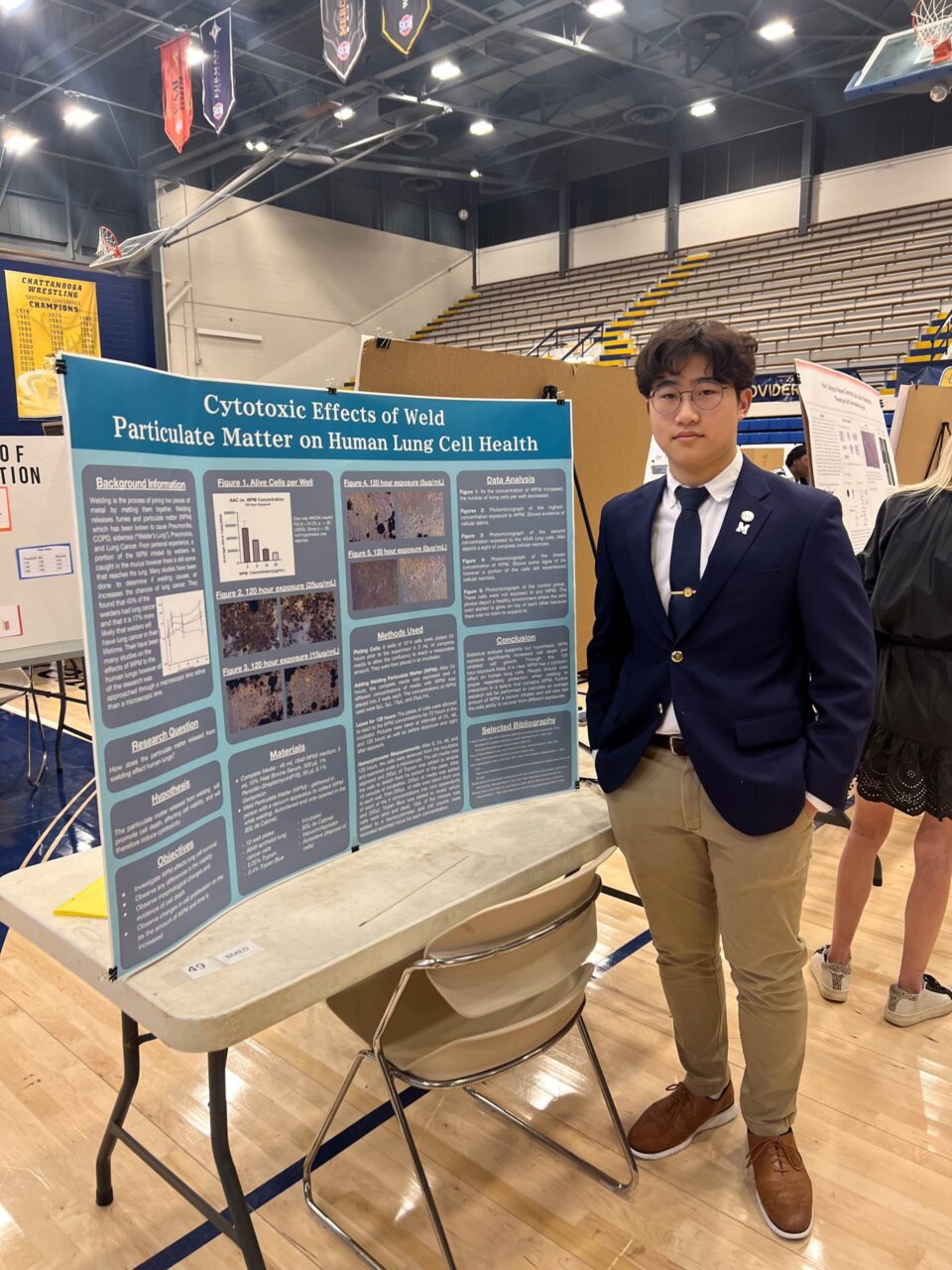 Before the judging began, Jeong reviewed his poster, “Cytotoxic Effects of Weld Particulate Matter on Human Lung Cell Health,” in preparation for the interviews.