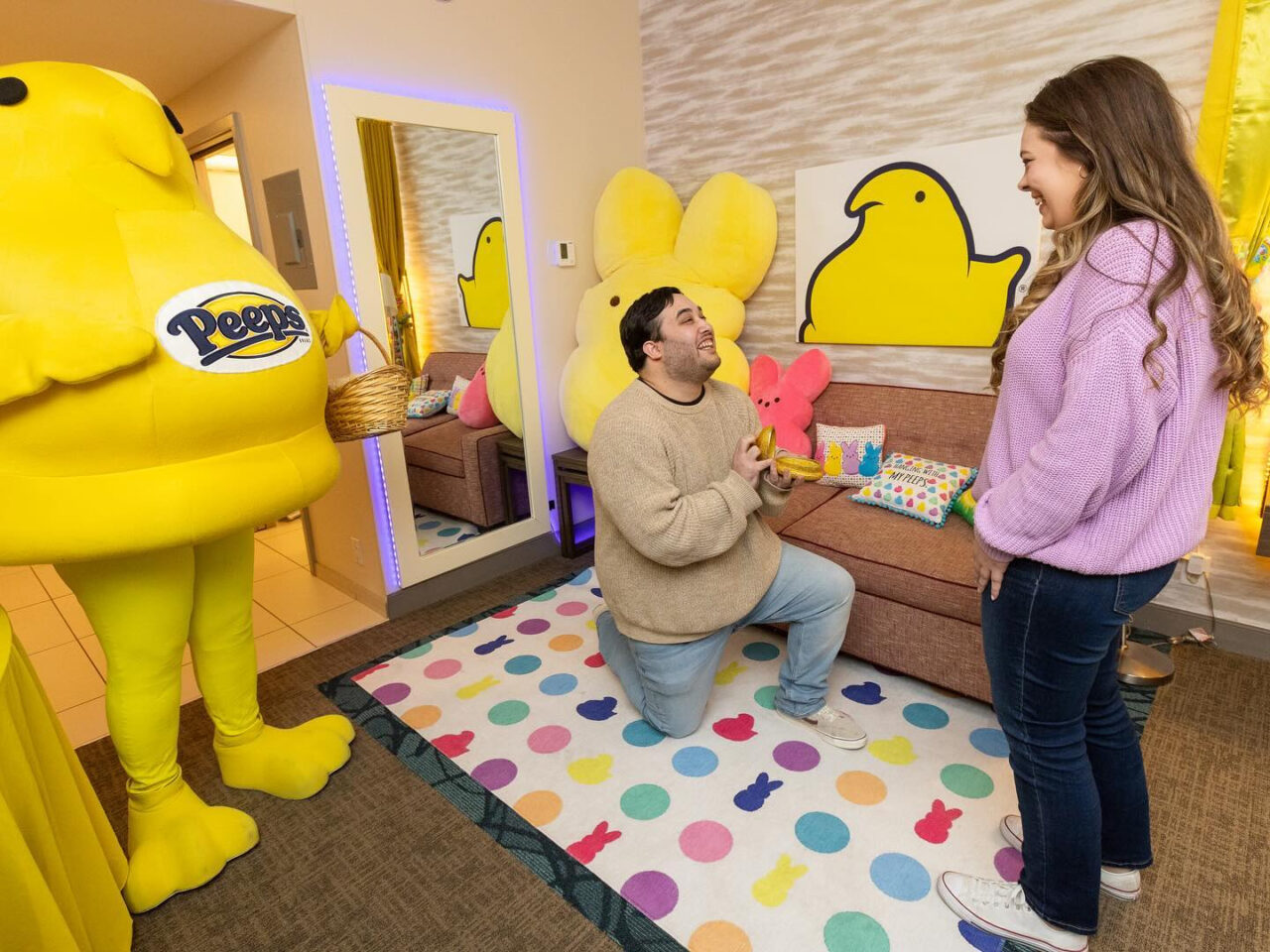 Matthew Rivera proposes to Carly Jessup in the Peeps Sweet Suite. Photo by Mark Stehle Photography for Peeps®