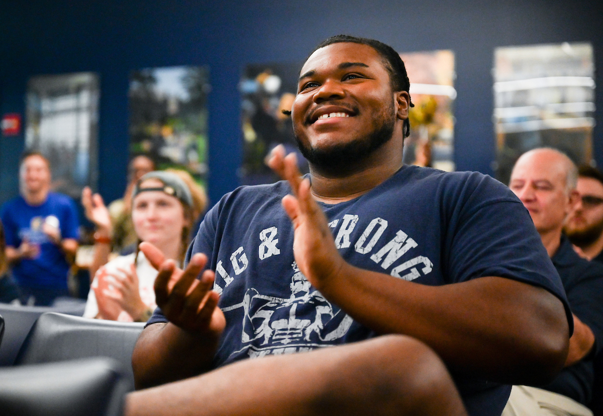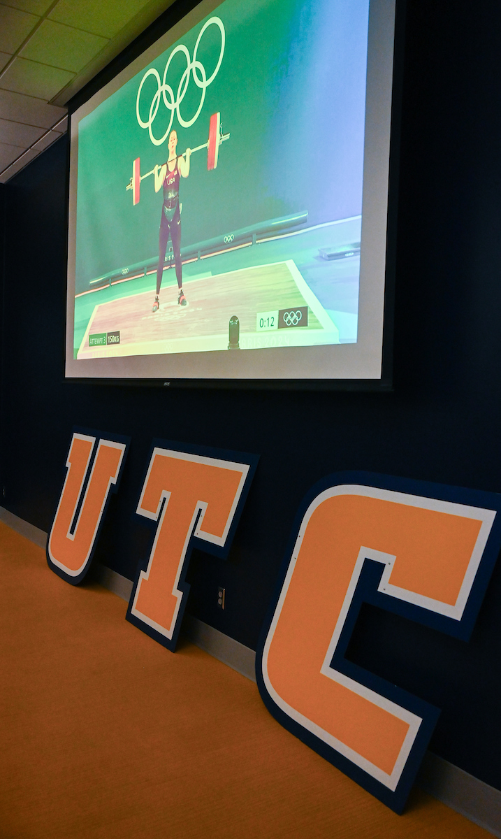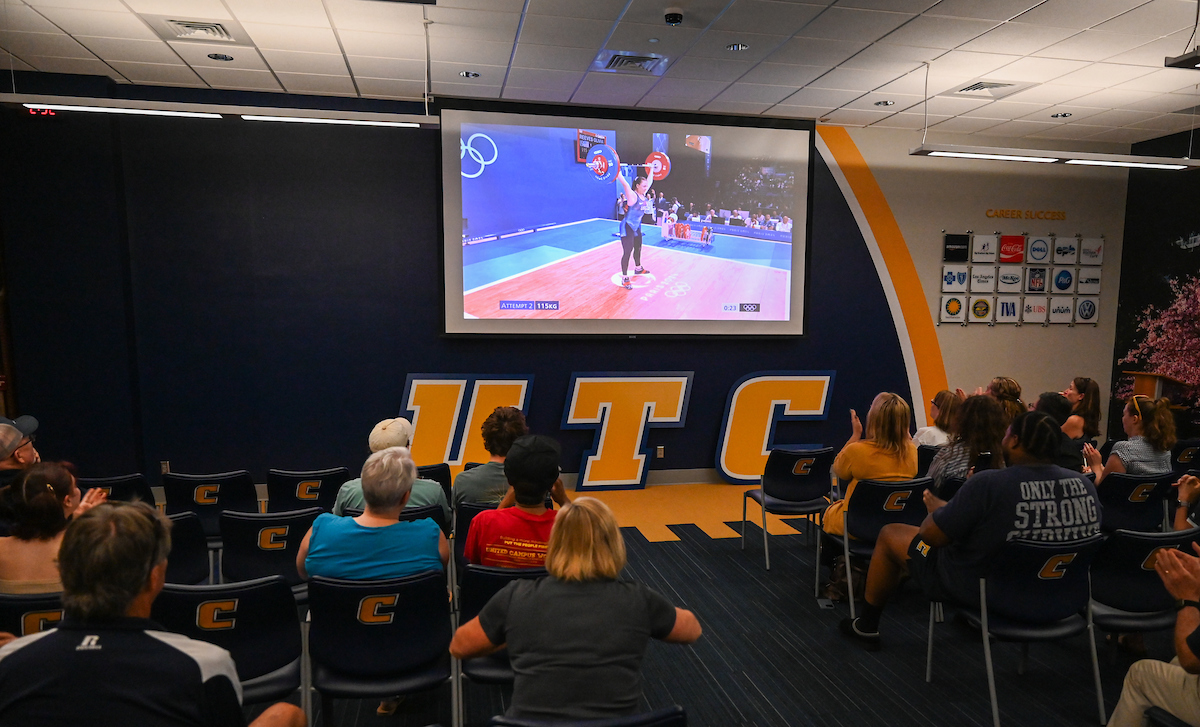Reeves was the first currently-enrolled UTC student to participate in the Olympics. Nearly 4,400 miles away from the Paris Expo Porte de Versailles weightlifting competition, approximately 100 members of the UTC family gathered in the UC Undergraduate Admissions tour center for a watch party cheering her on.