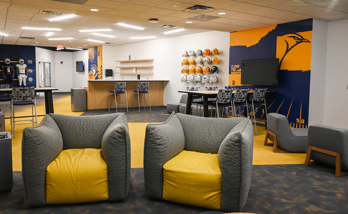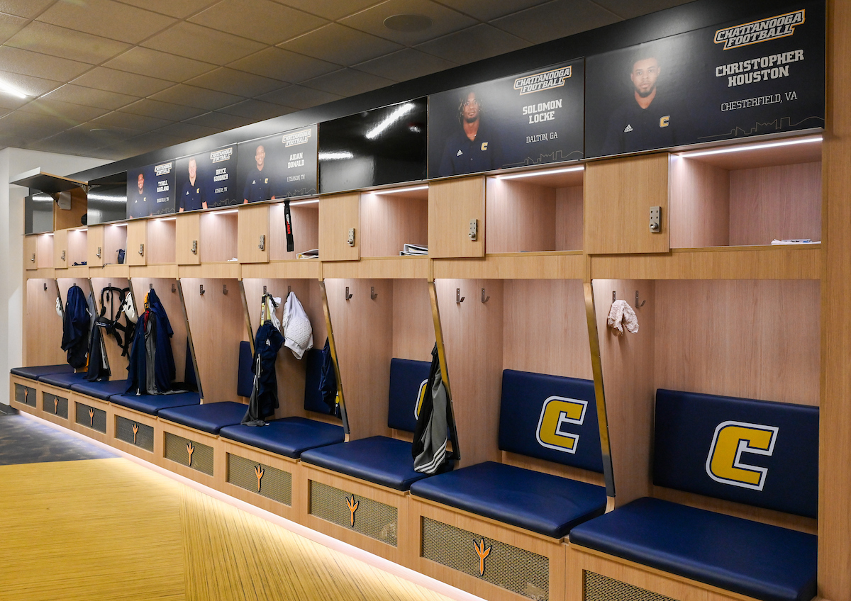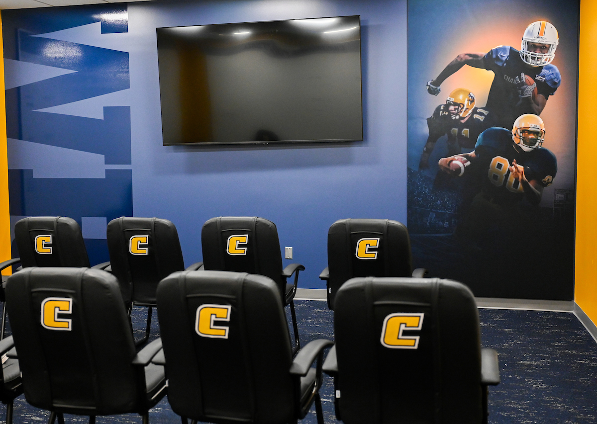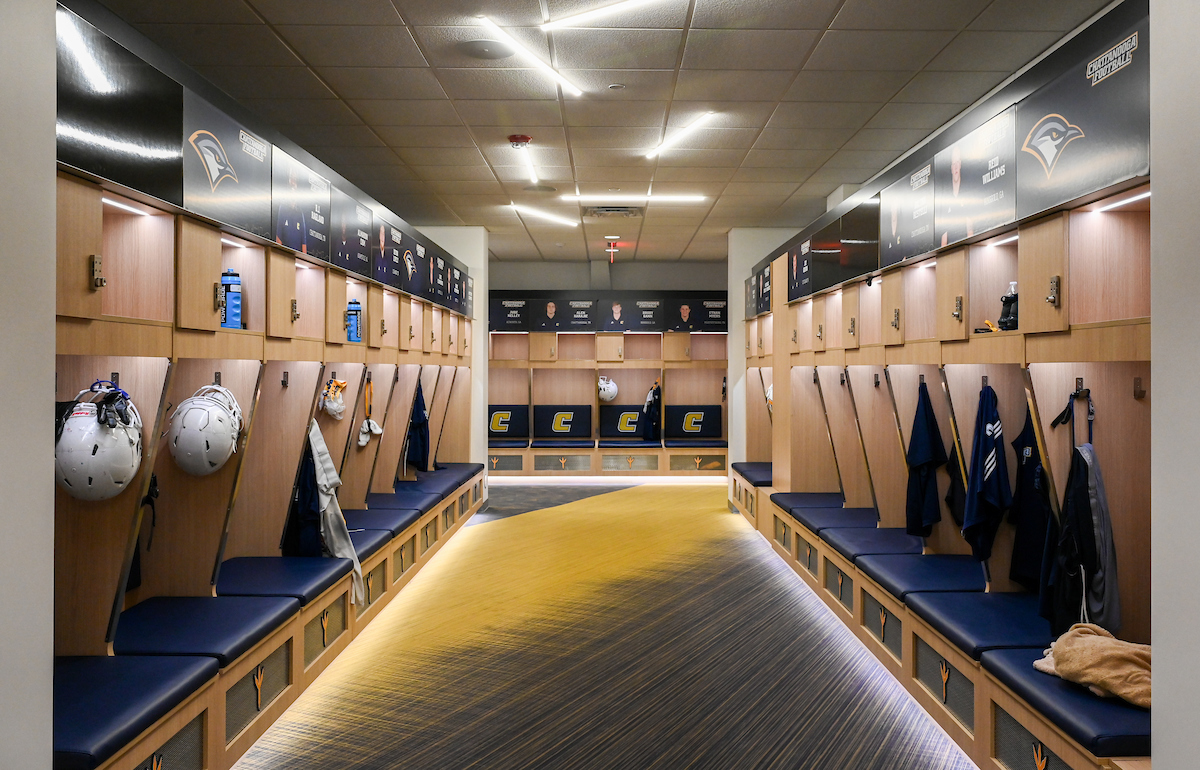 The new facility houses locker rooms, meeting rooms and offices for the football program.