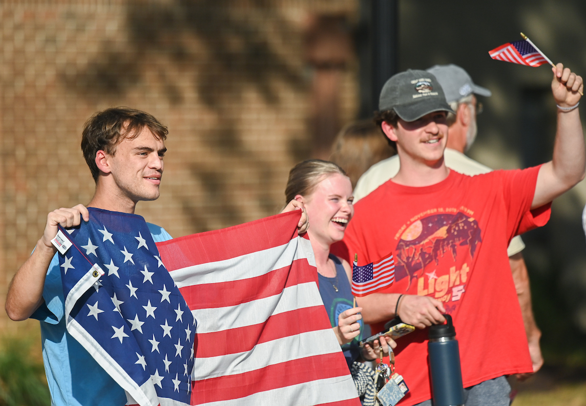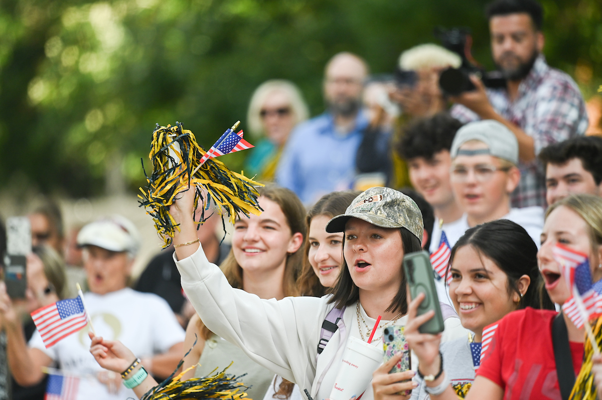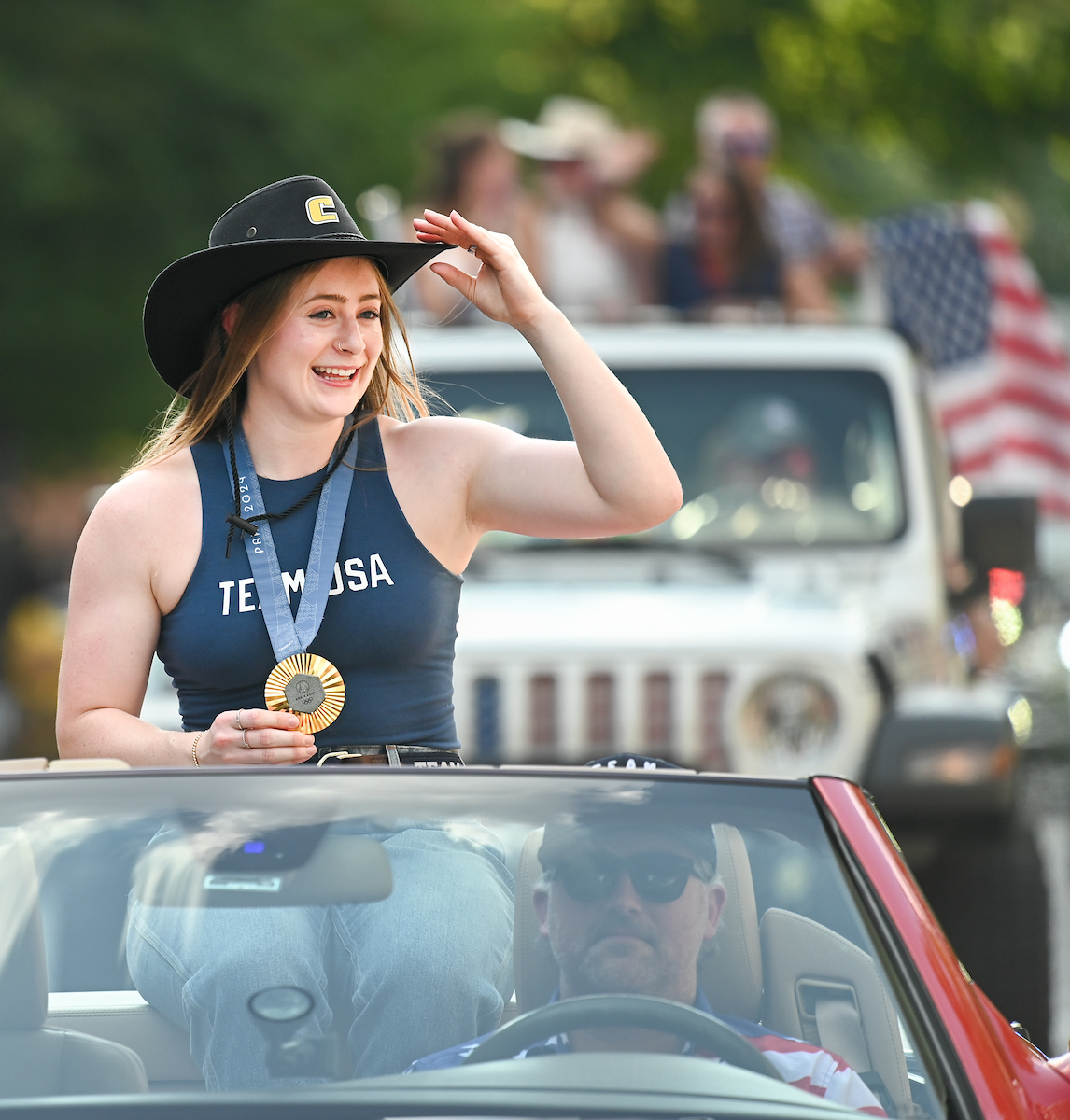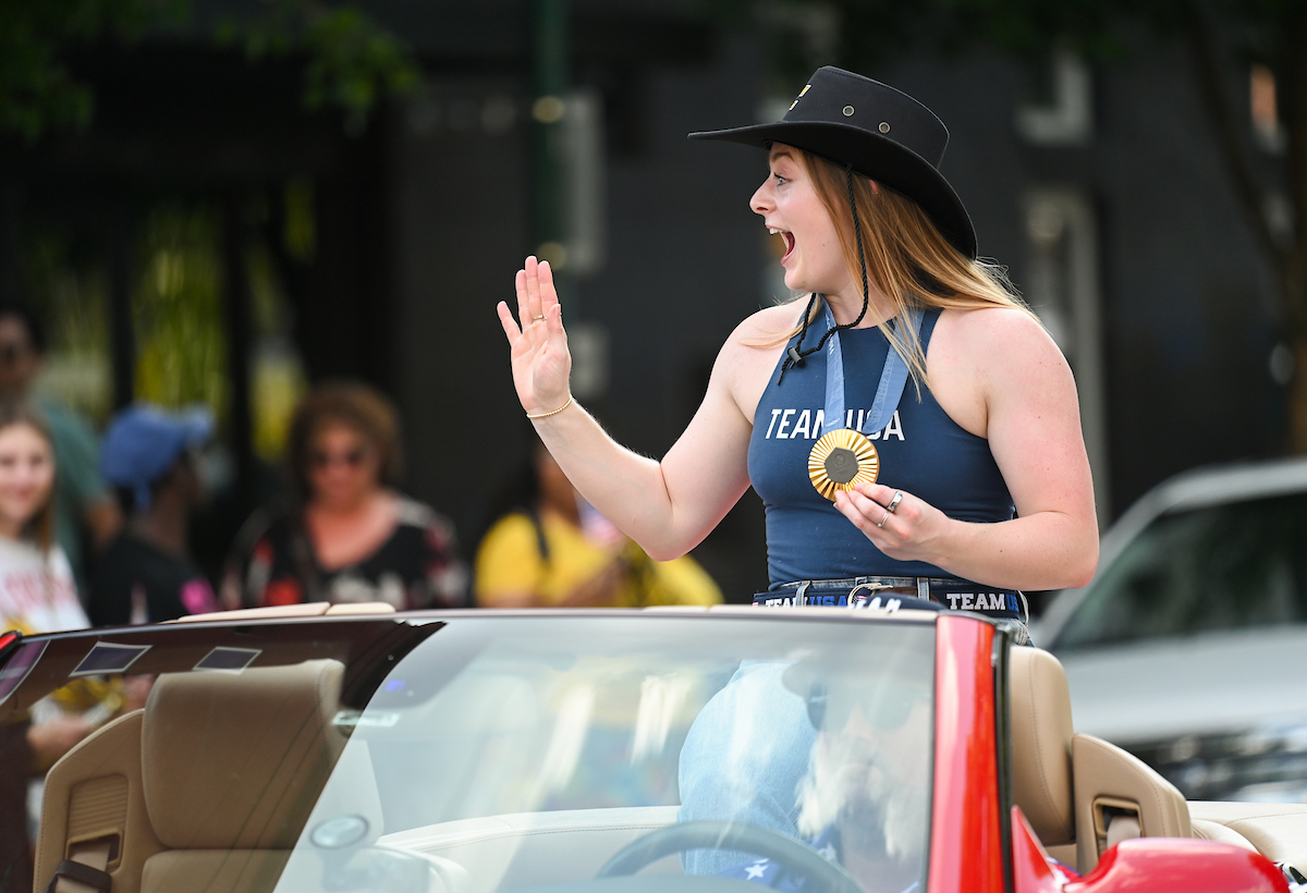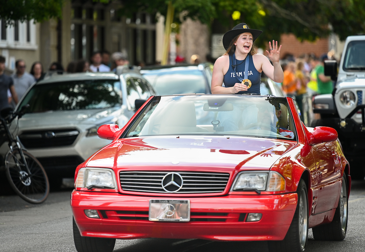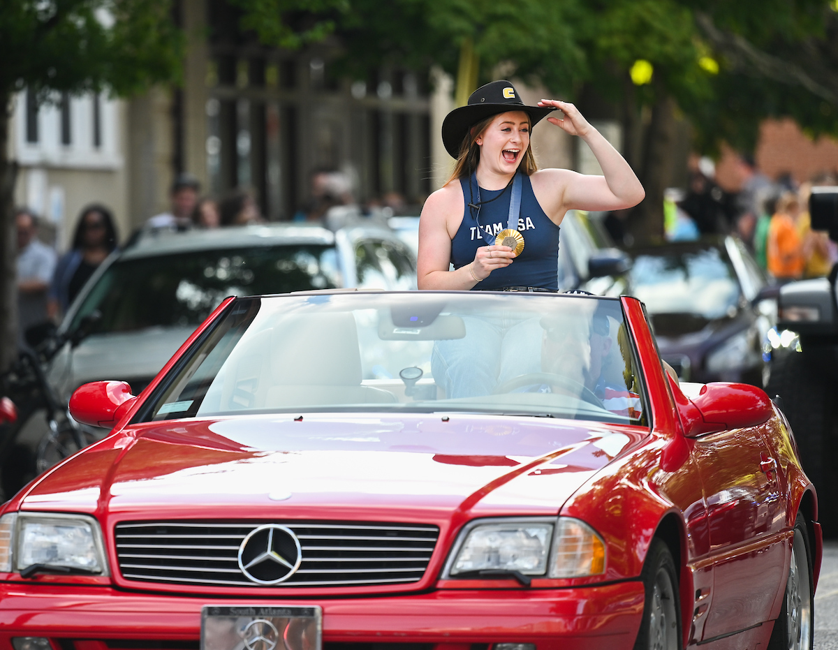 Olympic gold medalist and University of Tennessee at Chattanooga student Olivia Reeves waved from a red convertible to the students, alumni, faculty, staff and members of the Chattanooga community who lined Vine Street to cheer her on.