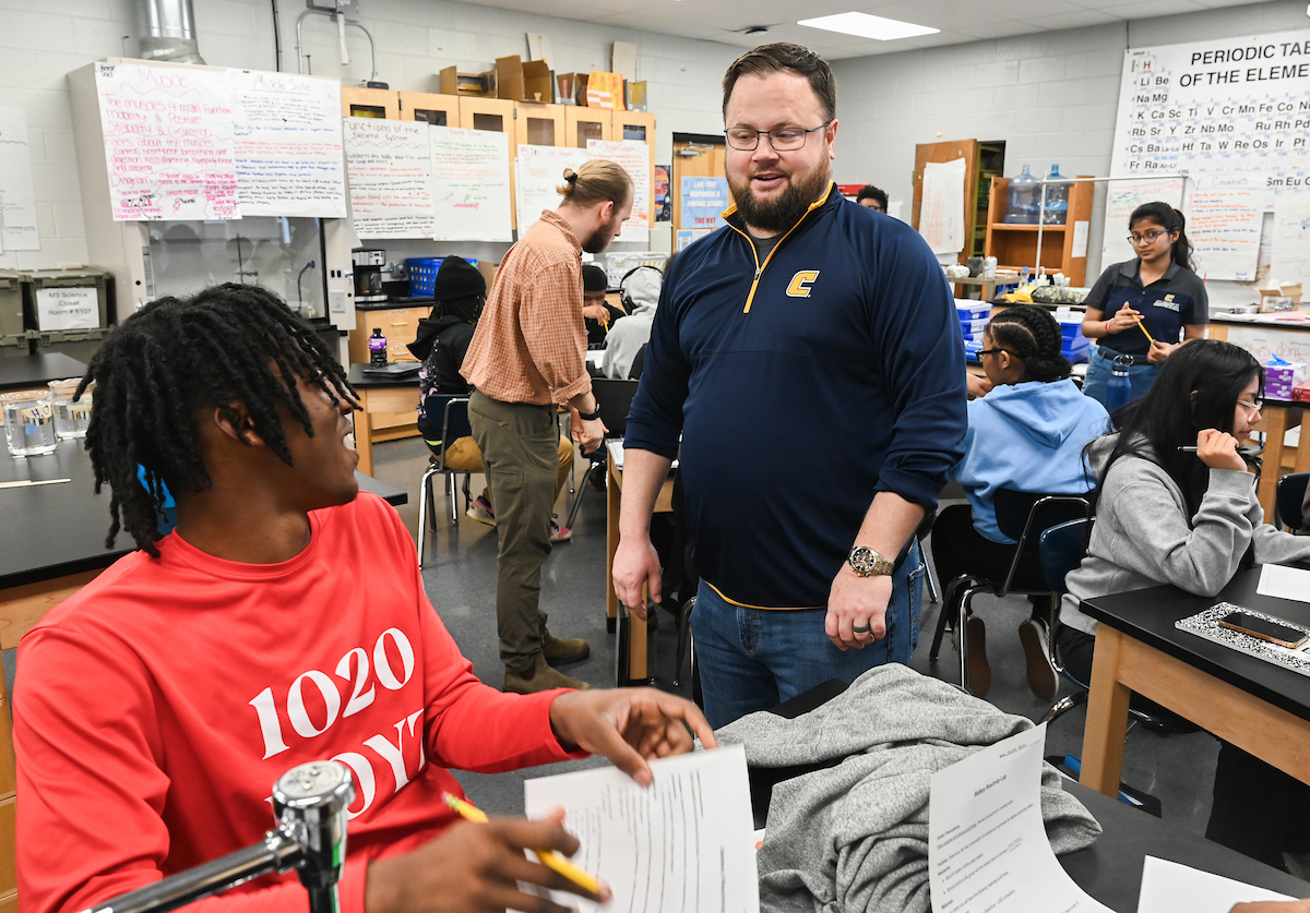 UTC’s Dr. Bradley Harris works with Brainerd High School students on Monday, Mar. 4, 2024. Photo by Angela Foster.
