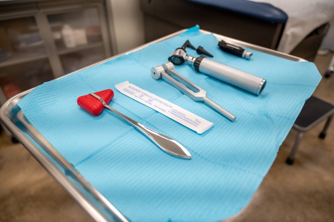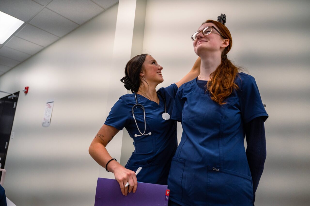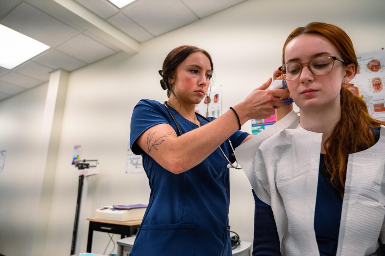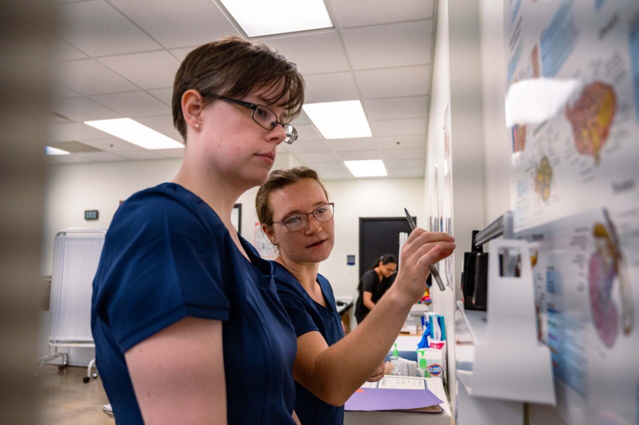 CMA students Riley Ottinger (left) and Skylen Casrill learn to use medical instruments. Photo by Noah Camacho.