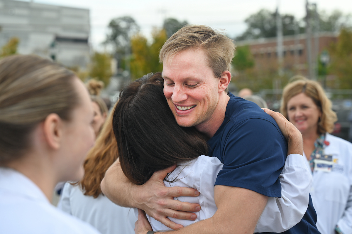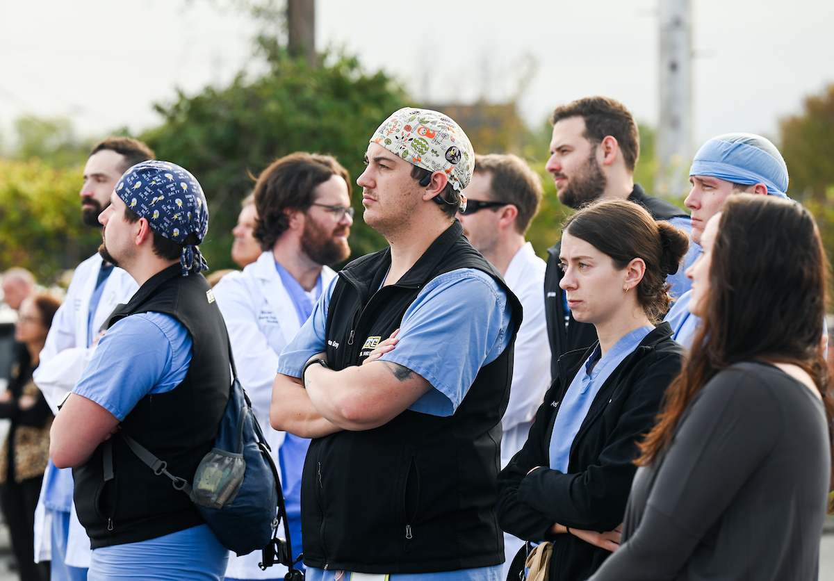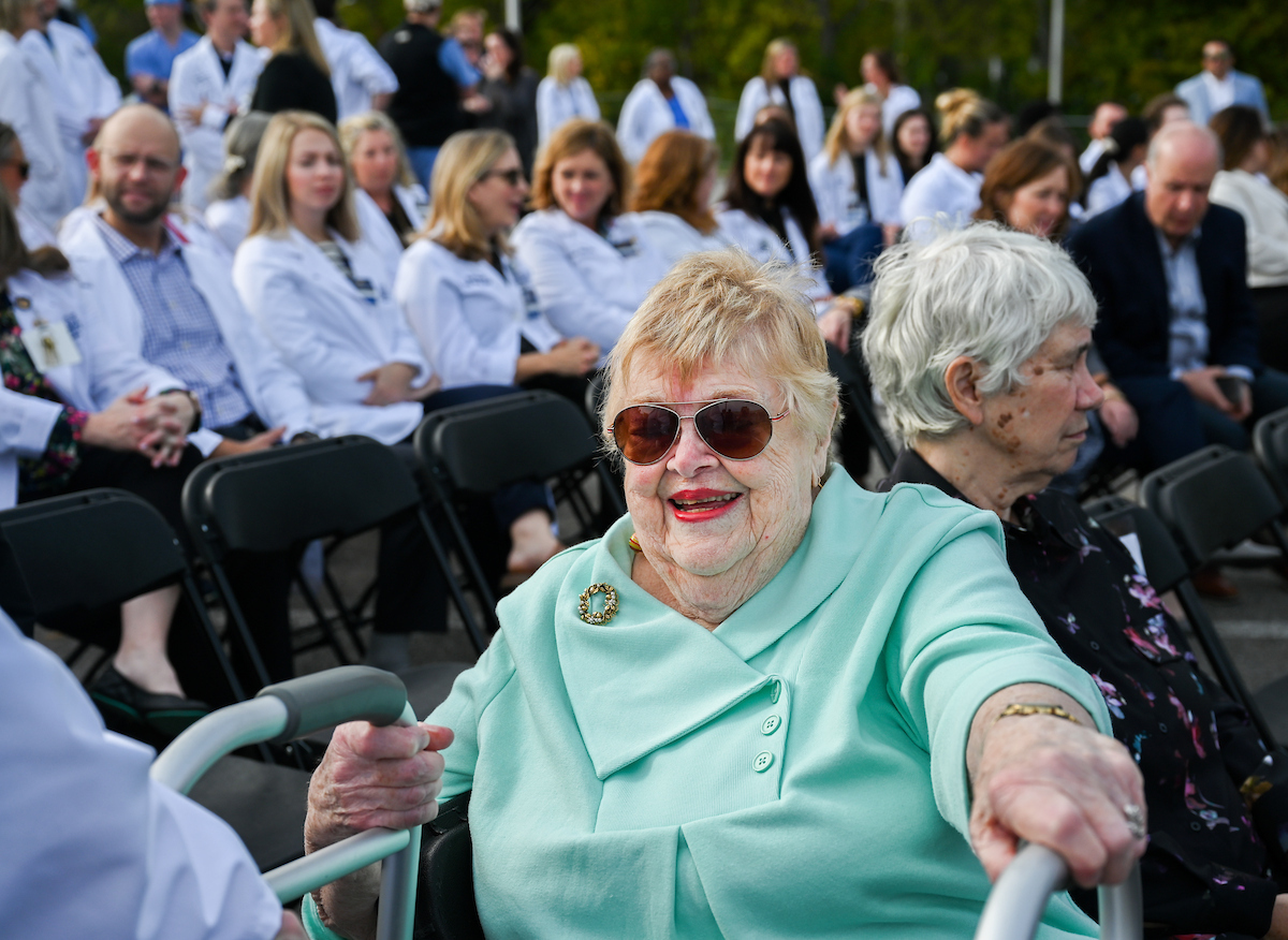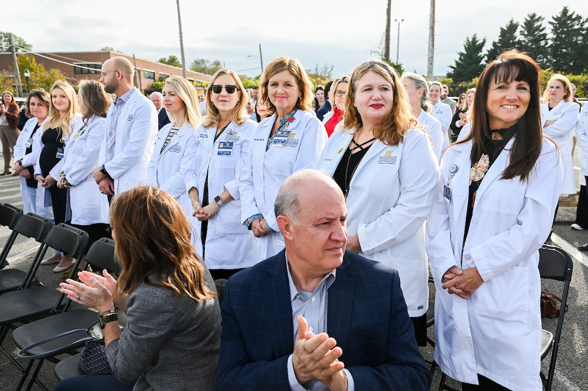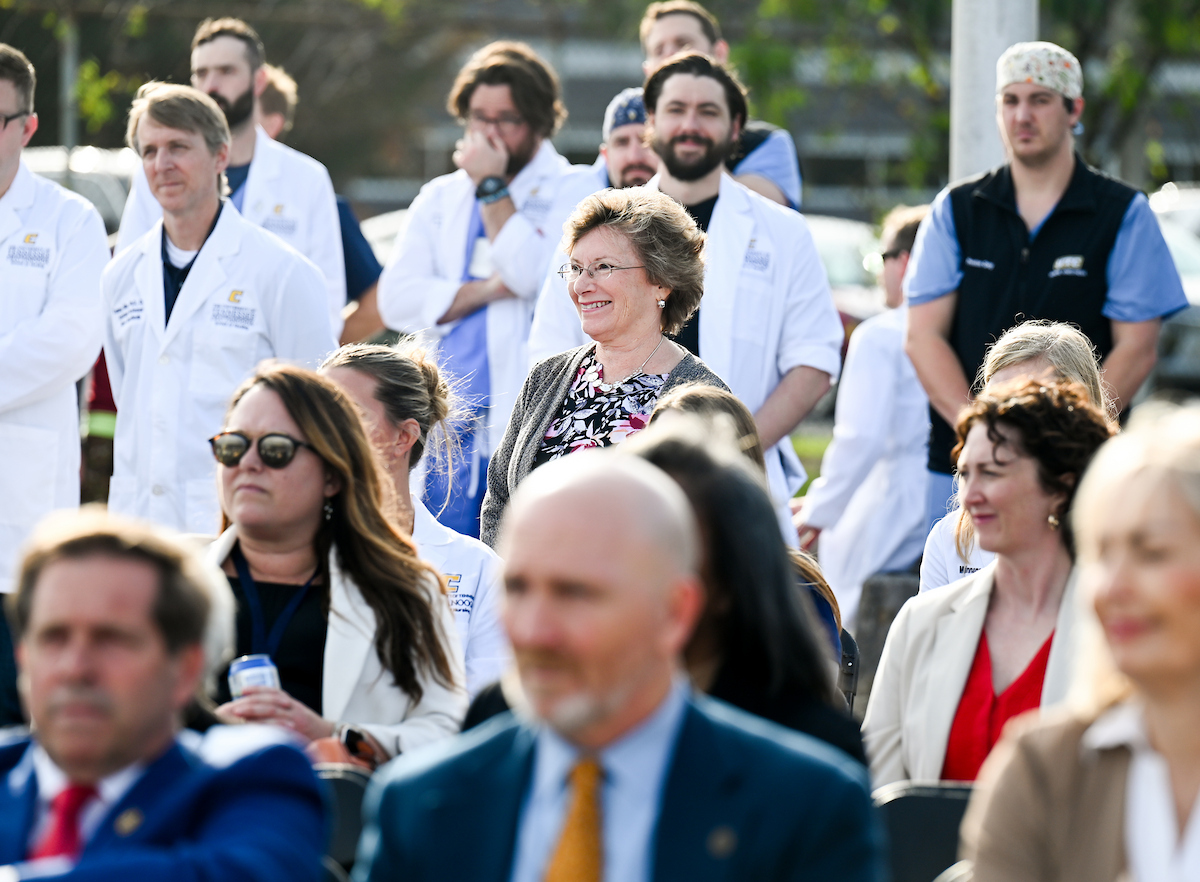 He acknowledged the School of Nursing faculty and staff wearing white lab coats in the crowd.