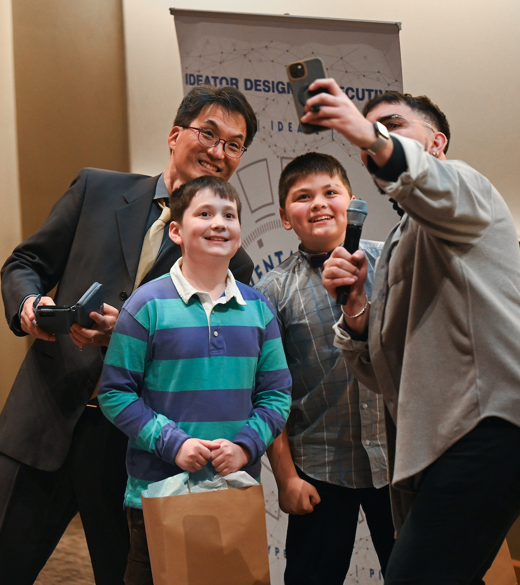 STEM School Chattanooga students Neal Khera, left, Maliki Lee and Josh Bun take a selfie with Inventanooga Program Director Kyle Carrasco and Dr. Subin Im after their team won the Inventanooga 2024 executive pitch competition. Photo by Angela Foster.