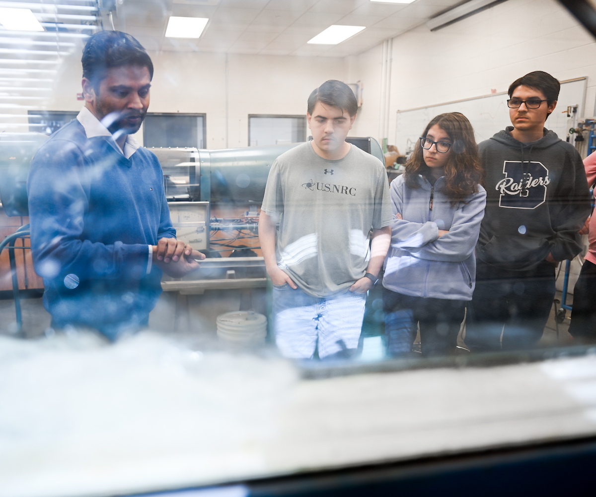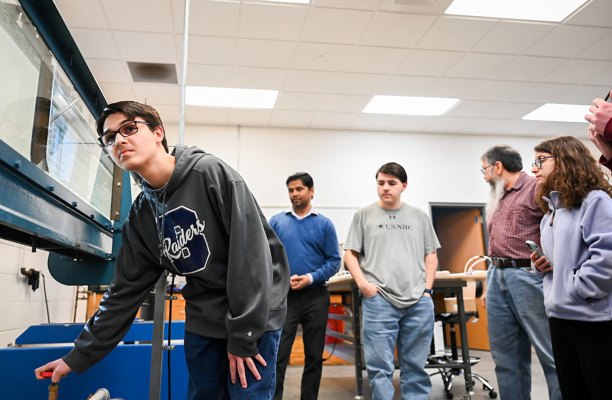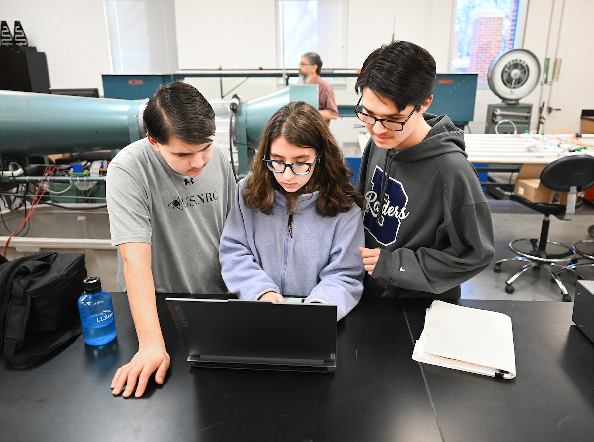 The Riggs triplets—Luke (left), Isabella and Matthew—work in Dr. Reetesh Ranjan’s fluid mechanics laboratory in the Engineering and Computer Science building.