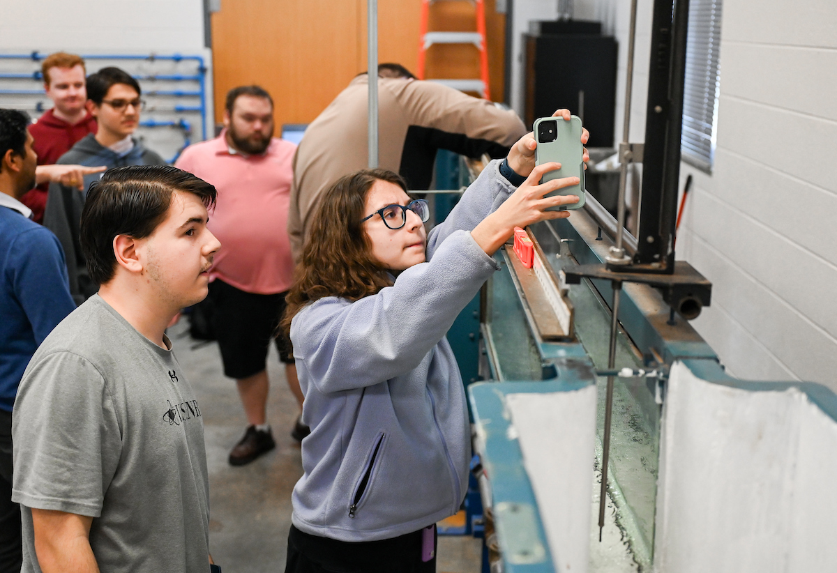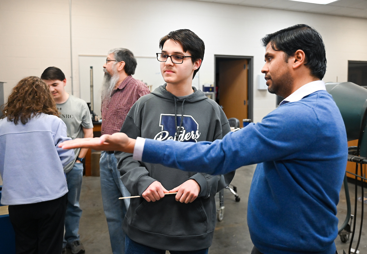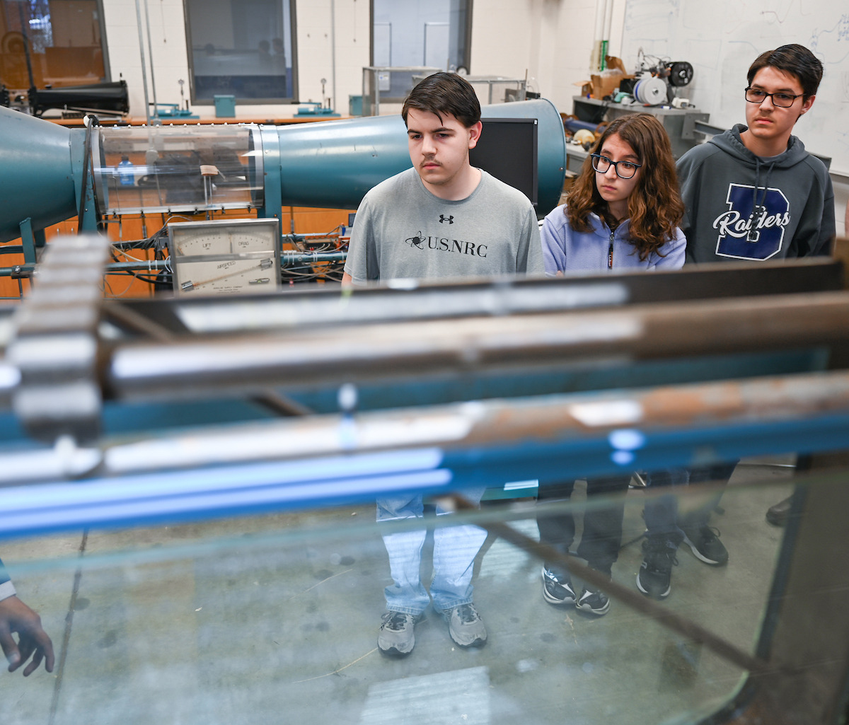 The Riggs triplets—Luke (left), Isabella and Matthew—work in Dr. Reetesh Ranjan’s fluid mechanics laboratory in the Engineering and Computer Science building.