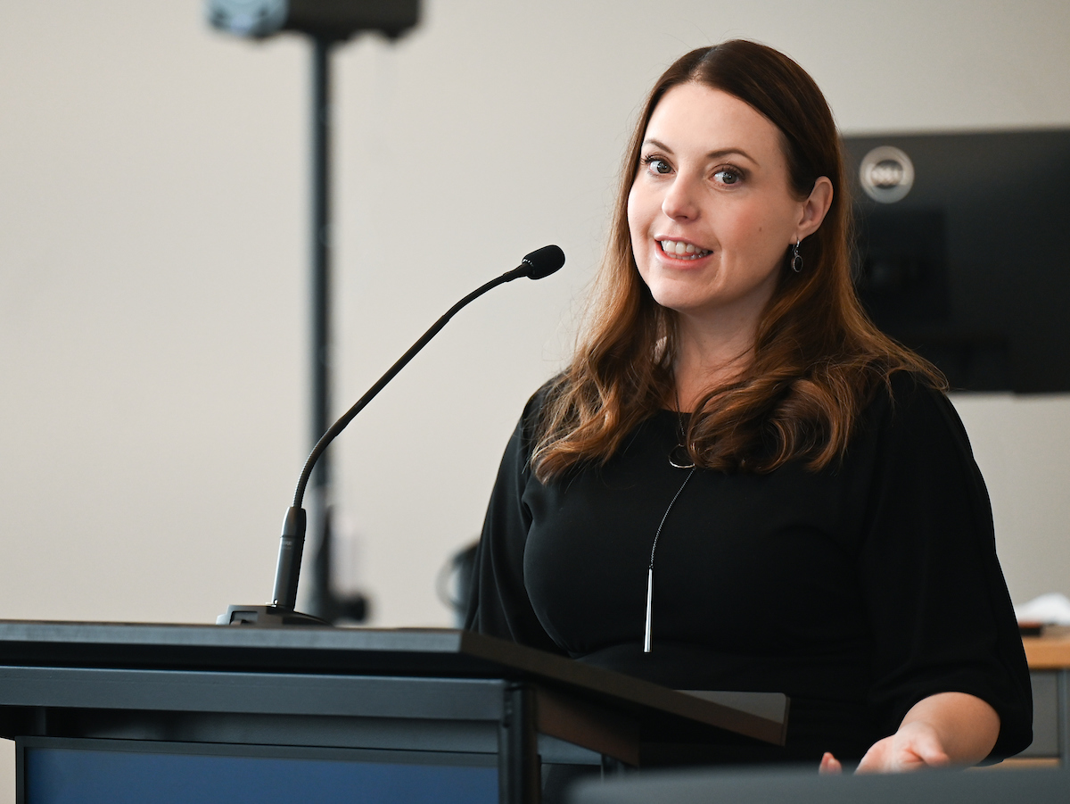 Business students Kyla Leonberger (finance) and Breonna Gandhi (accounting) gave a presentation about the SMILE Fund—a UTC undergraduate-led investment fund.