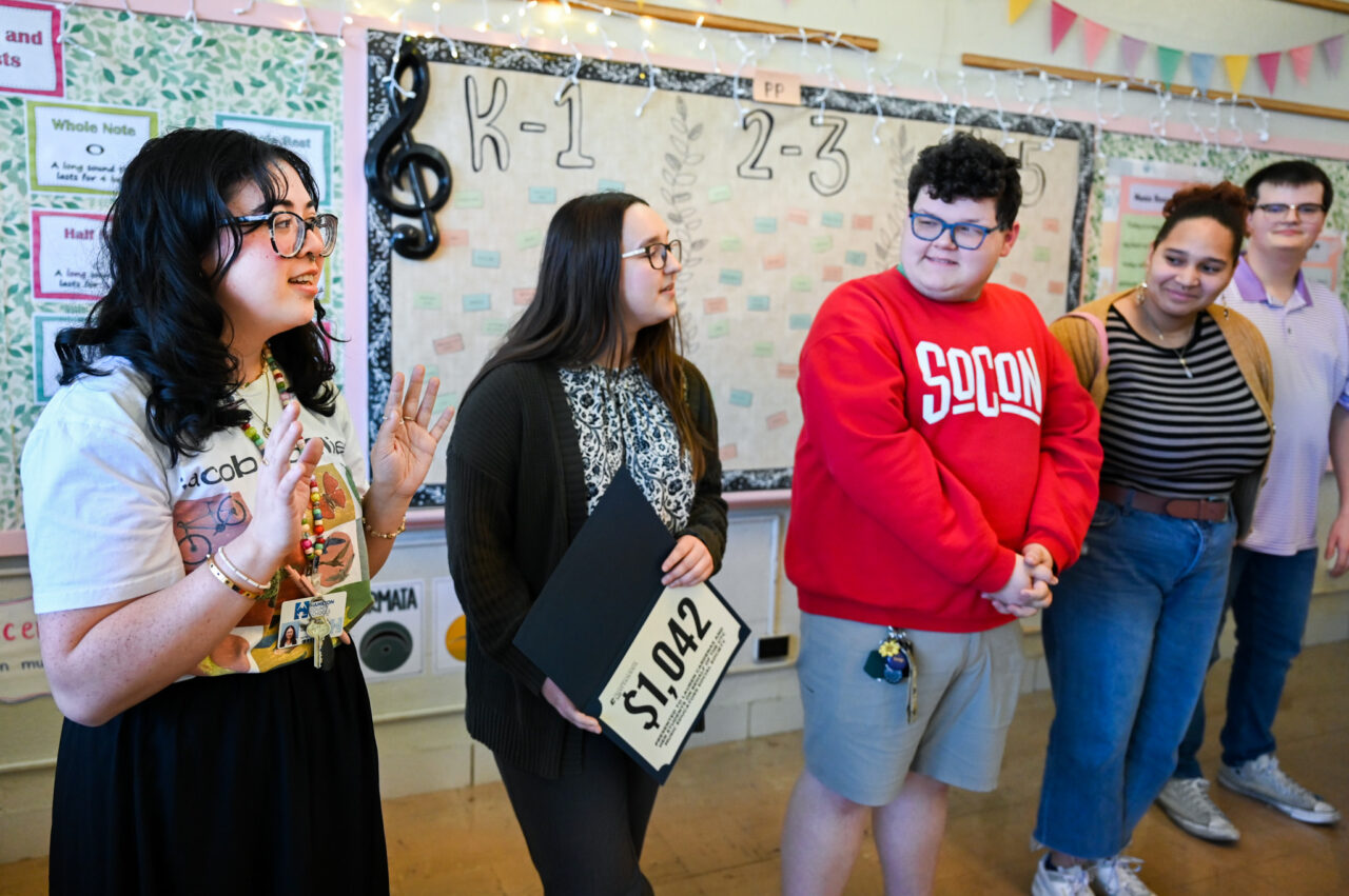 Members of UTC’s Music Educators Social Society student organization, accompanied by the group’s faculty advisor—Associate Professor Ali Allerton—had come to DuPont to present her with $1,042 raised to support her classroom. The visit, staged under the pretense of observing her in the school, left Cardenas both shocked and overjoyed as she accepted the generous gift.