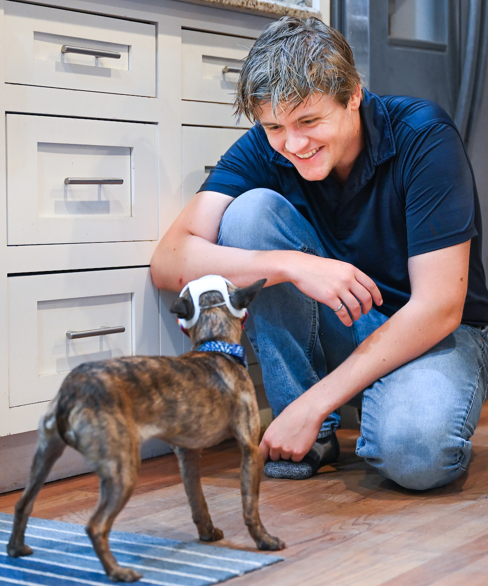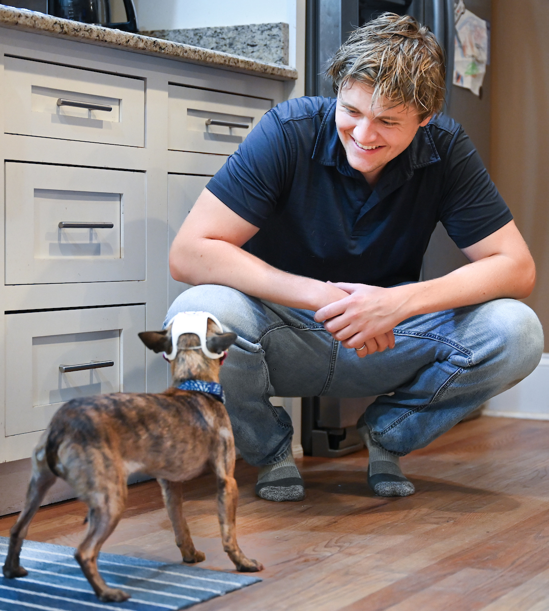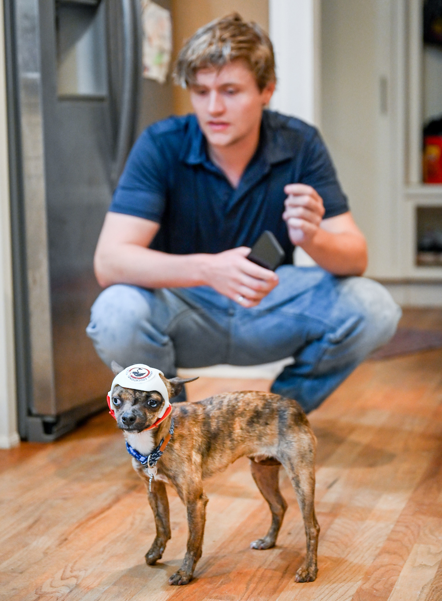 UTC mechanical engineering student Connor Mackey hangs out with Wrexham in the Chihuahua’s Chattanooga-area home. Photo by Angela Foster.