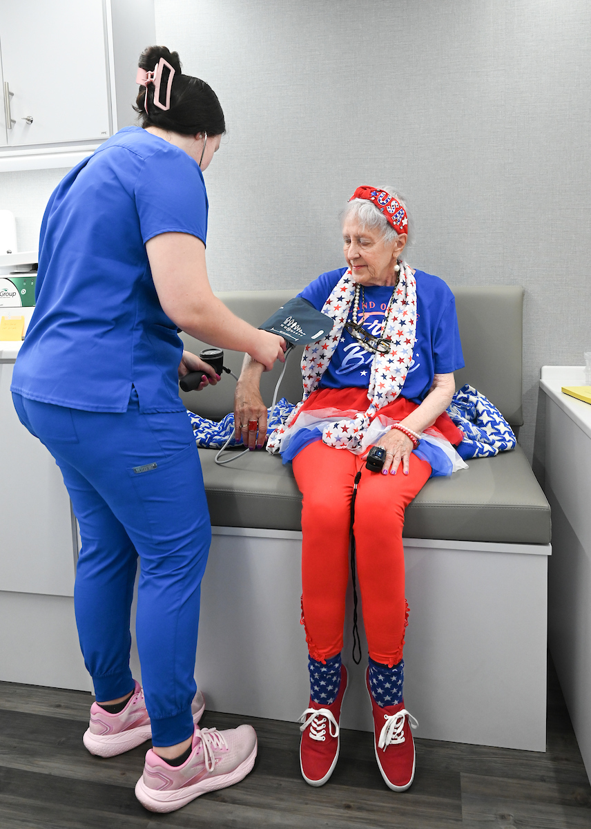 Dr. Kristi Wick takes a patient’s blood pressure in the Rhea Richland Senior Neighbors Center.