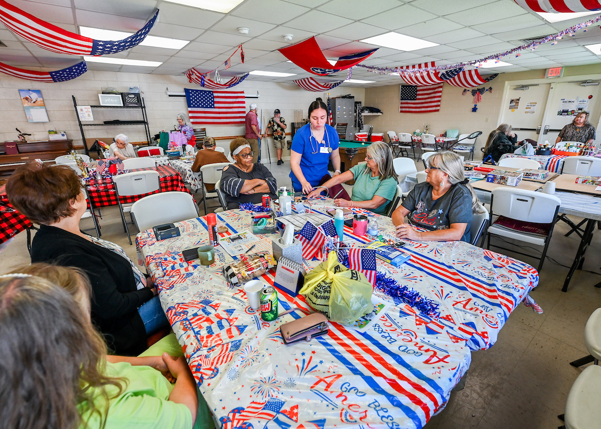 “Are you going down to the clinic?” Grove yelled to her friend, both dressed in red, white and blue as part of a Flag Day celebration at the center. “You need to.”