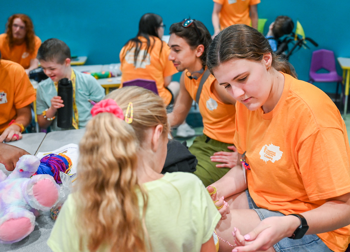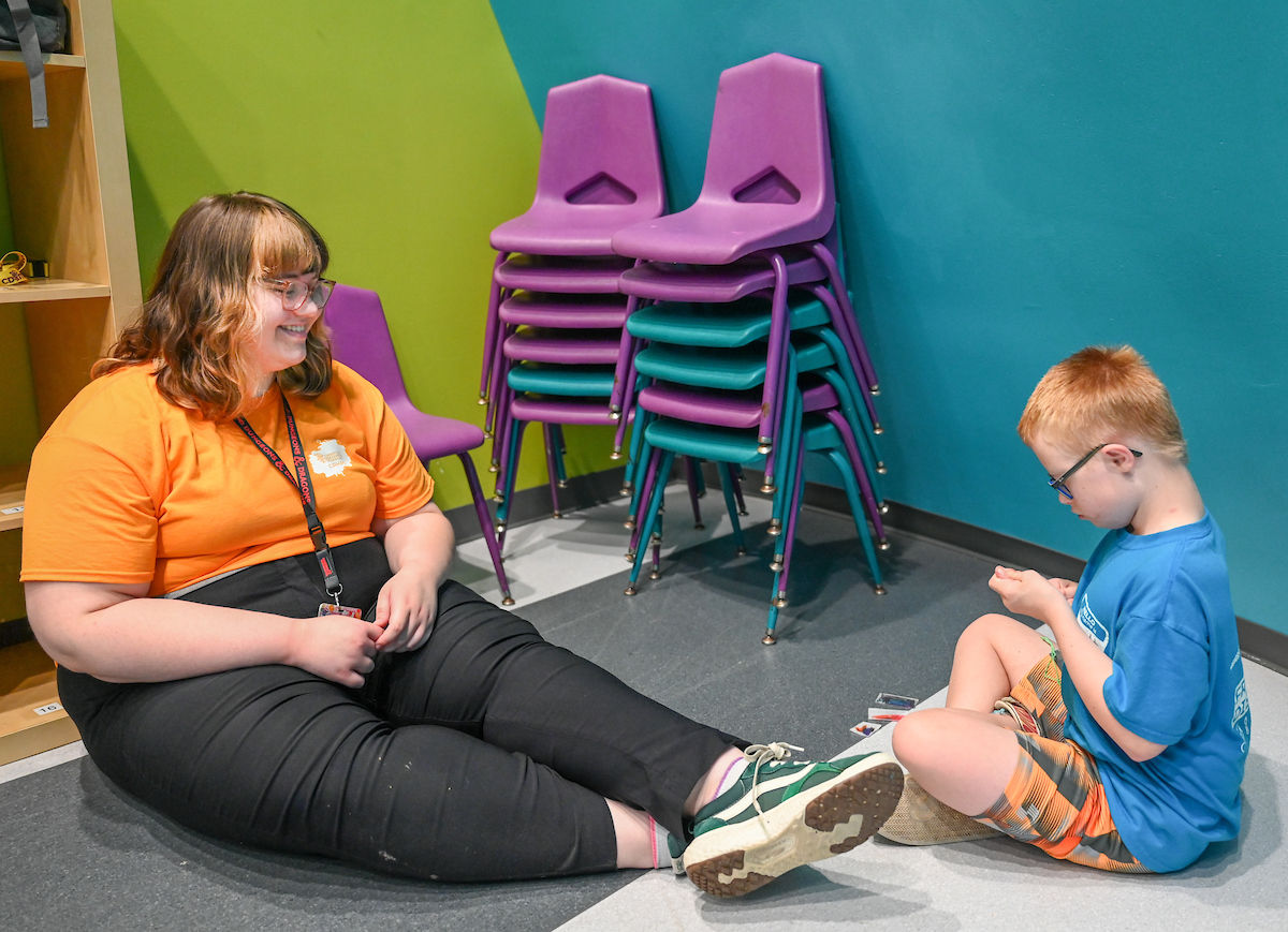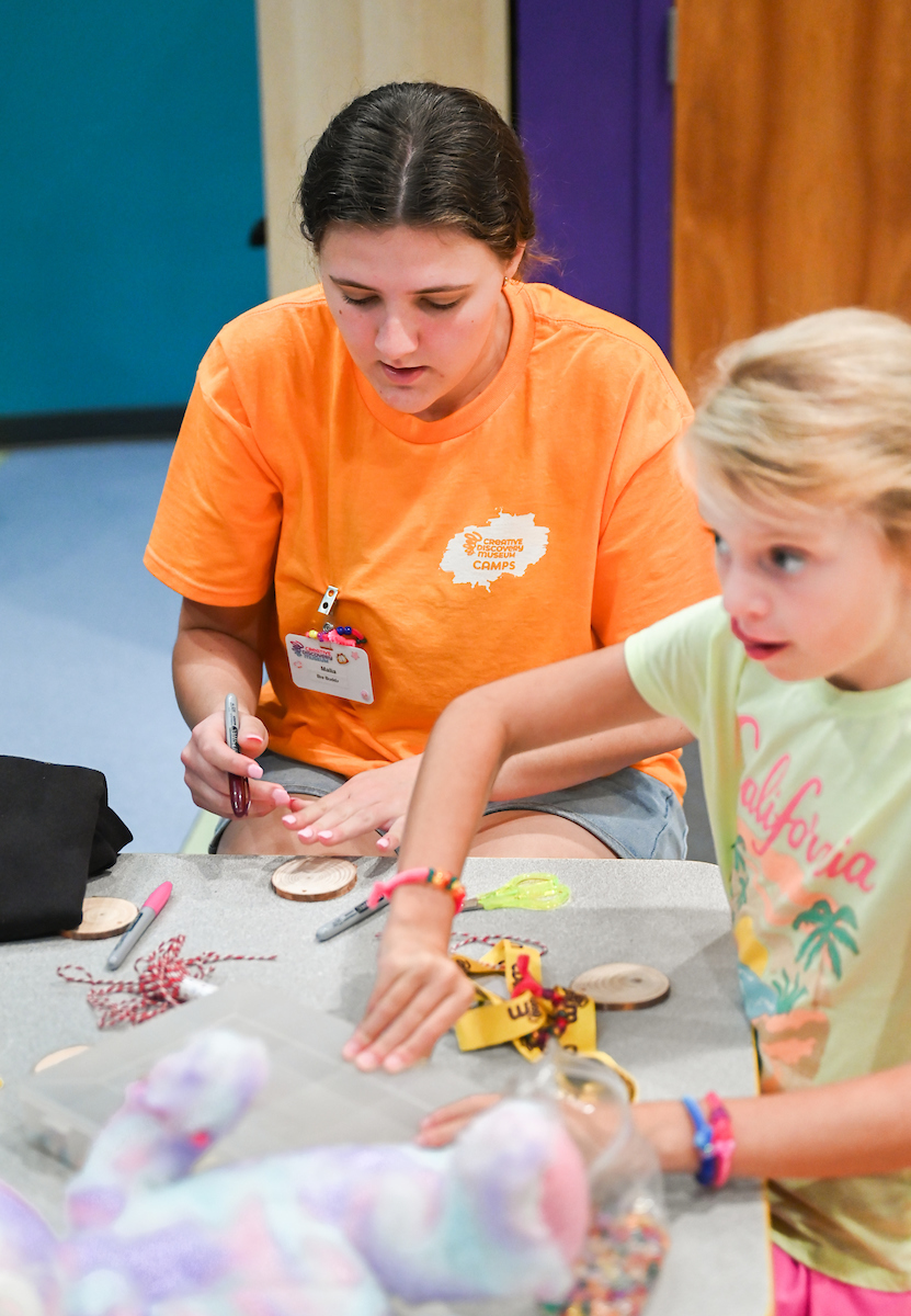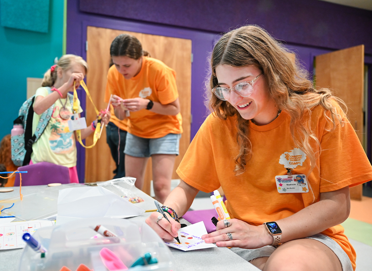 Psychology student Joy David works with a Friends’ Discovery Camps camper at the Creative Discovery Museum.