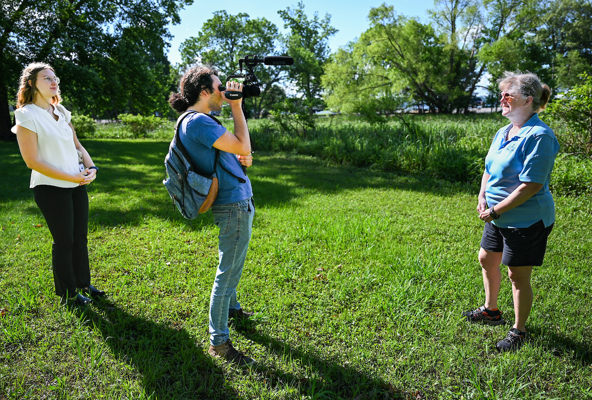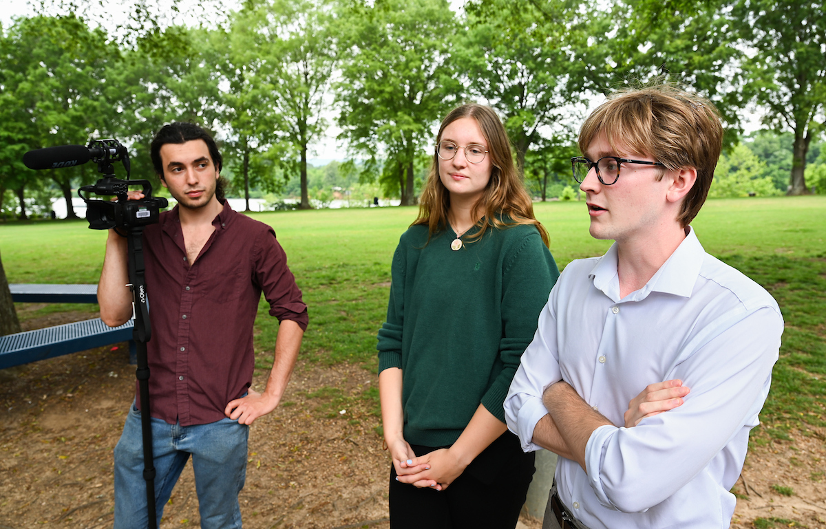 Alex Harris (left), Abigail Borden and Gabriel Ghani recorded an episode of “Our Parks, Our People” at Chester Frost Park. Photo by Angela Foster.
