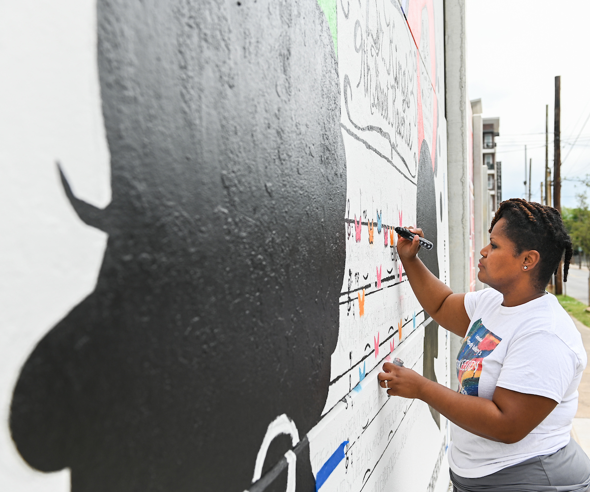 “I love creating art that can speak to a sense of place and the energy of a place—and emphasizing story. Anything that allows me to be a part of storytelling is wonderful. This is a young woman who could represent a student at UTC or someone coming of age, and she will have this dream-like expression on her face. In her hair, there are images of people dancing, musicians, people engaged in civic engagement—basically to reflect the history of what’s happened on 9th Street and MLK. It’s a lively culture and how she’s an heir to the type of history that belongs to her and the people in this area. And she takes ownership of it.”