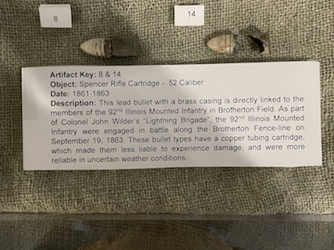 Each is on display in glass cases at the Chickamauga Battlefield Visitor Center in Fort Oglethorpe, Georgia. Each was uncovered on the battlefield by a student at the University of Tennessee at Chattanooga.