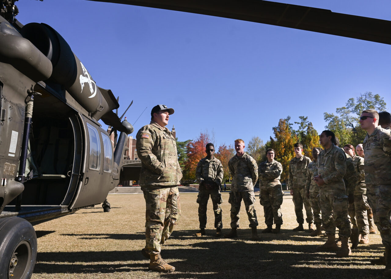 On Wednesday, Nov. 1, White landed a Blackhawk helicopter on Chamberlain Field to give ROTC cadets at UTC a chance to ride in the aircraft—or “airframe,” as those in the Army call it—and also to answer questions from the cadets.