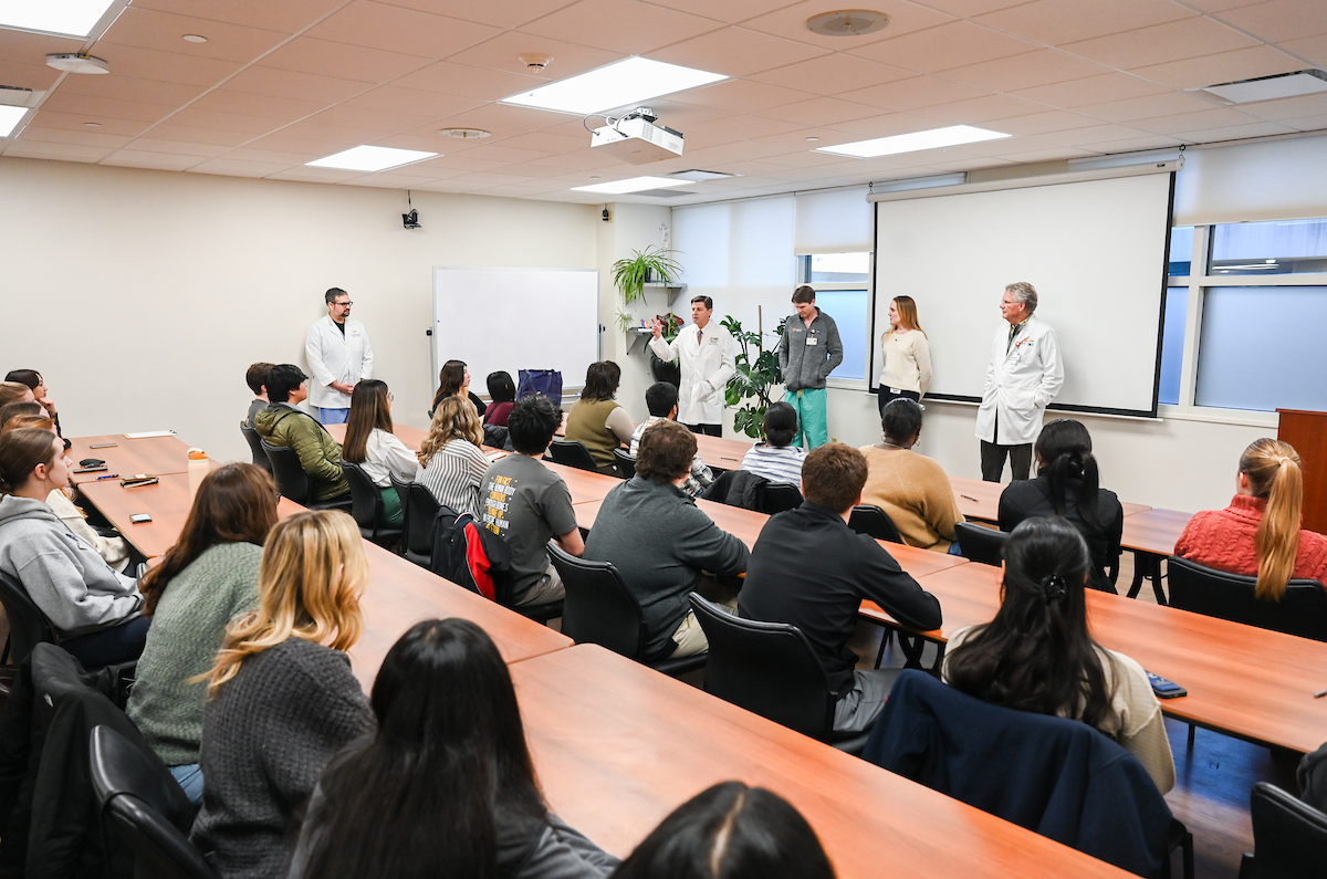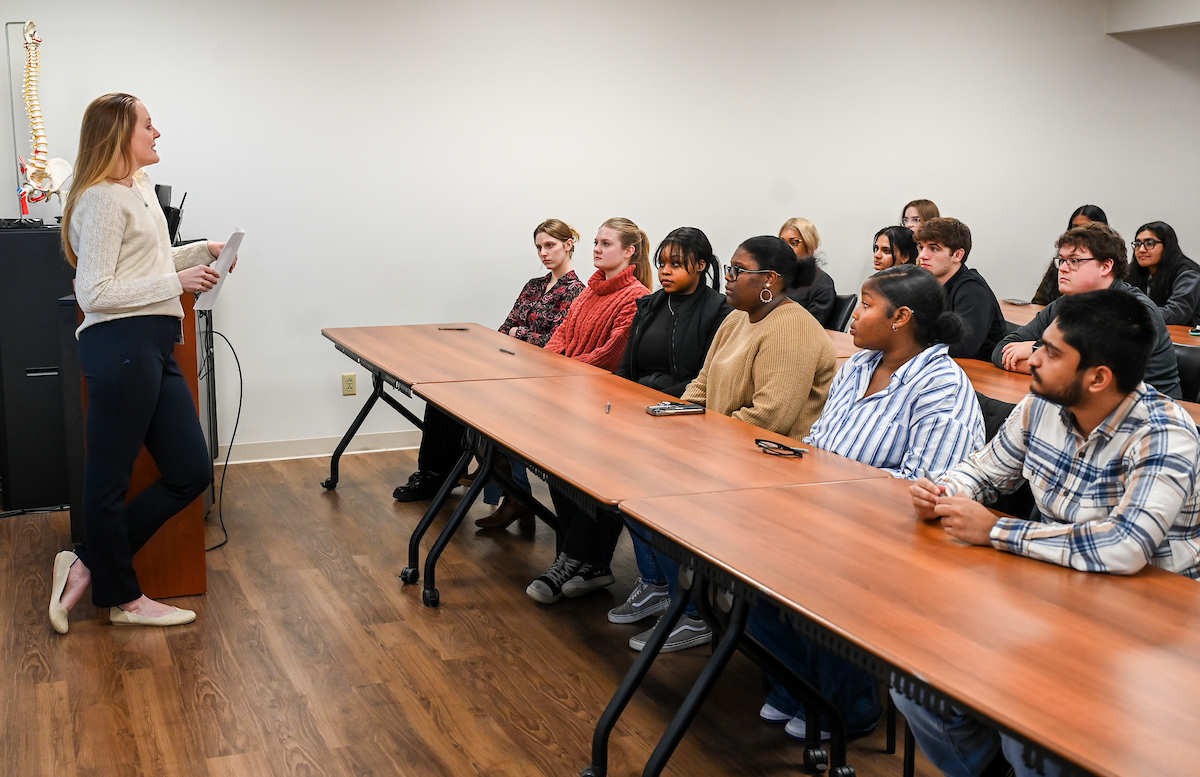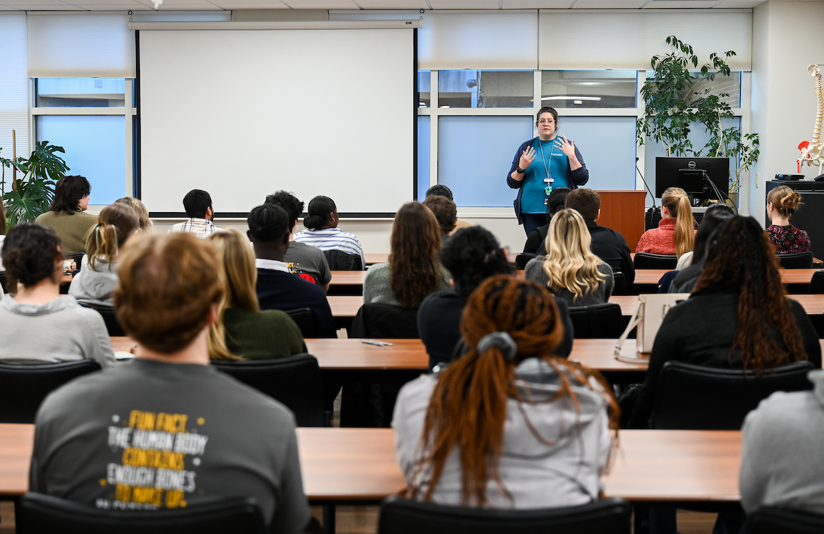 Dr. Karen Rogers speaks to a group of UTC students at the Erlanger Baroness Hospital job shadowing orientation. Photo by Angela Foster.