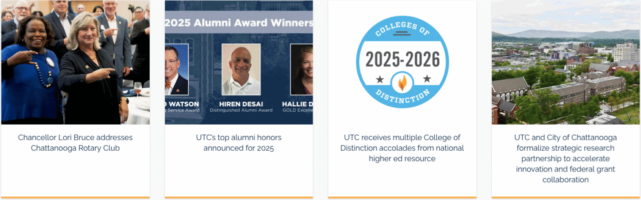 The UTC News Widget automatically pulls the latest stories from the UTC News blog directly into our website, keeping content fresh and relevant without having to manually update. Designed to showcase campus achievements, research breakthroughs, student success, and more, the news widget is filtered by specific programs, colleges, or topics—making it easy to deliver targeted news to different audiences. It’s an effective way to keep prospective students, families, and community members engaged with the exciting things happening at UTC, while also connecting current students, faculty, and staff with updates on programs, people, and activities across campus. If you’re interested in integrating the UTC News Widget onto your department’s webpage, please reach out to the Web Team here.