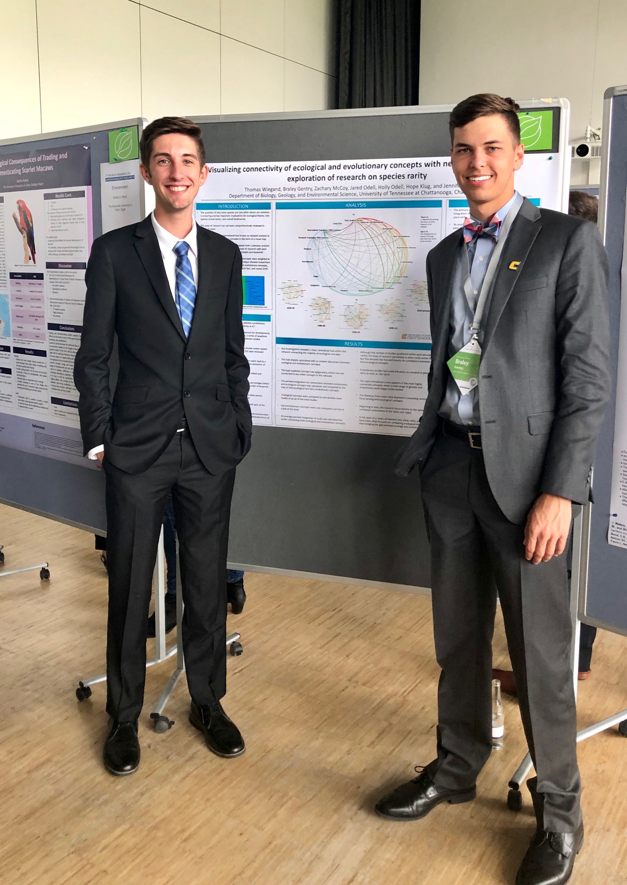 Gentry and Wiegand presented a poster entitled “Using network analysis to visualize connectivity in ecology concepts — an exploration of research on species rarity” based on their research here at UTC and were the first students from UTC to attend WorldCUR. They also presented their work at the National Conference on Undergraduate Research (NCUR) at Kennesaw State University in April 2019 and at the SoCon Undergraduate Research Forum (SURF) at Wofford College in November 2018.