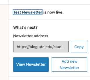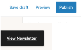 - Publish or Update the newsletter with the blue “Publish” button at the top, then click “View Newsletter” in the “Page updated” message that appears at the bottom left corner in the editor.