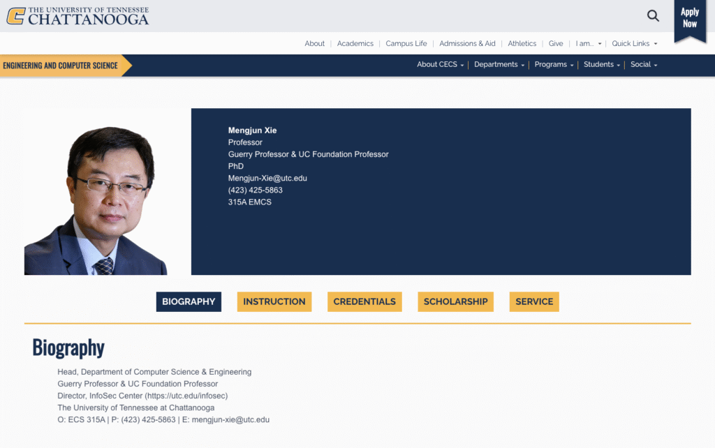 The UTC website provides faculty members with the opportunity to display professional information such as their biography, teaching areas, academic credentials, research and scholarship, and service activities. This content is powered by a data feed from Digital Measures, a system where faculty members maintain and update their own information. On faculty and staff listing pages, this enhanced profile is accessible through a “More Info” button located beneath the individual’s photo and contact number, offering visitors a detailed look at each faculty member’s academic and professional background.
